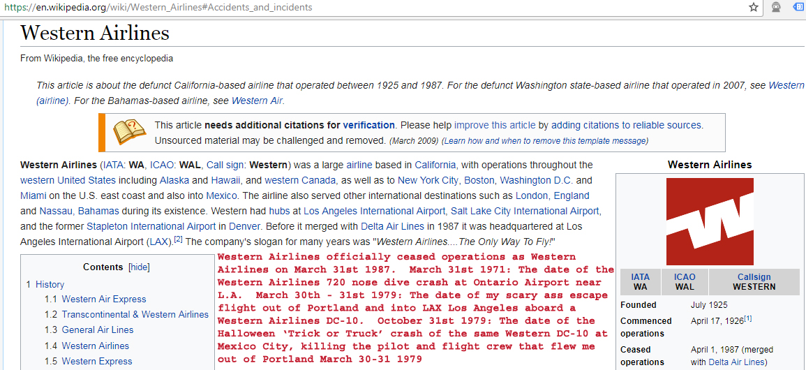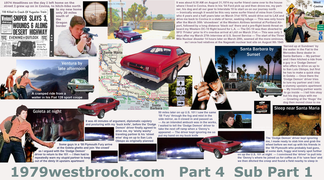 Caskey was 'busted' that following summer of '69 on a charge of having sex with a minor under 18. The acting and improv skills that I learned in Caskey's Drama Class were to prove invaluable to me there in the following 10 years to come, what with all the murder, mayhem, subterfuge and conspiracy that was to plague me on up to March of 1979 when the shit hit the turbine fans of the Western Airlines DC-10 that flew me out of Portland on March 30th and into LAX Los Angeles on March 31st 1979.