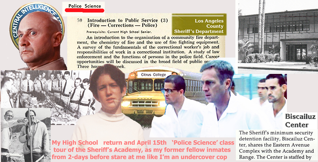 During the April 15th 1971 Police Science Class tour of the L.A. Sheriffs Academy with L.A. Det. Sgt. Ostman and about a dozen or so of my fellow student classmates from Gladstone High that remained out a an original number of around 25, I was paraded around in front of a dozen or more of the inmate-trustees who I was incarecerated with up until only two days before, there at the Officer's Dining Room and later thereat the pistol firing range.
