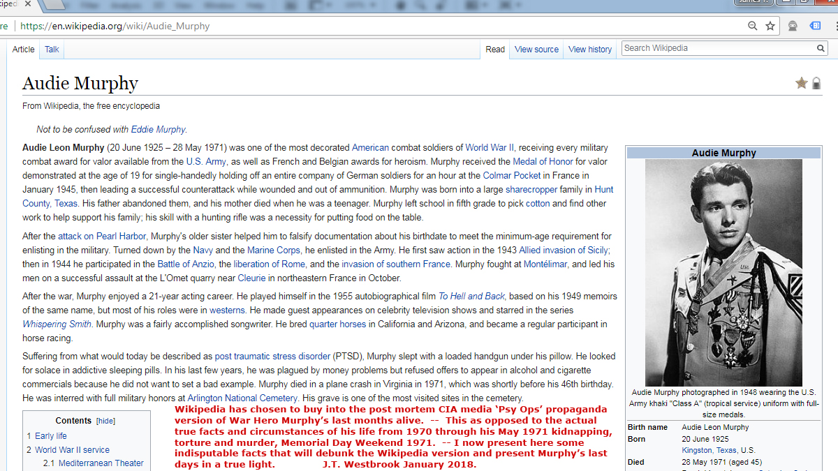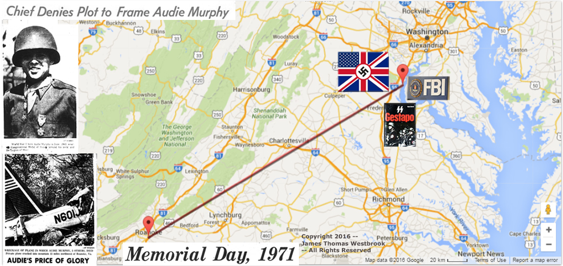 The timing of Audie Murphy's disappearance and death Memorial Day Weekend in May 1971 is also telling in that it provided the CIA assets in the press electronic media the opportunity to put a 'Memorial Day' 'spin' on Murphy's death. -- It also and gave the braggarts, blow hards, cowards and characater assassins around the Memorial Day weekend barbecues and beer kegs, in order to slander Audie Murphy and his legendary record as one of America's greatest war heros.nk