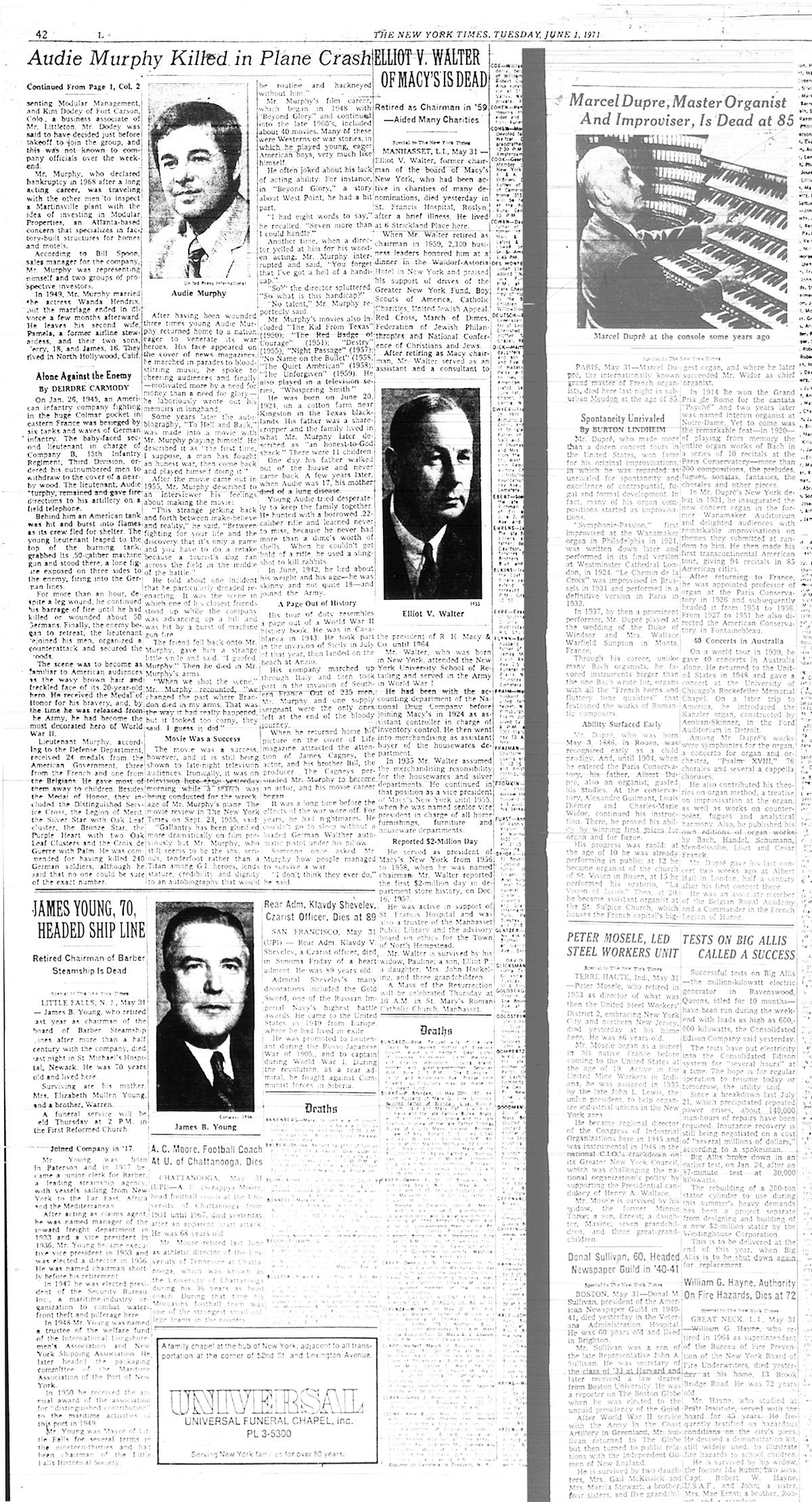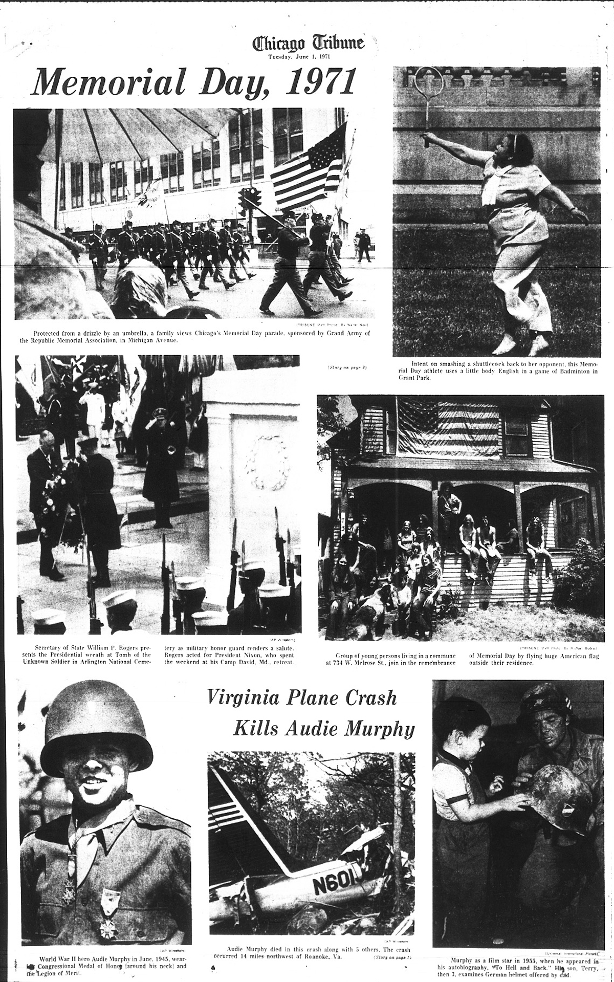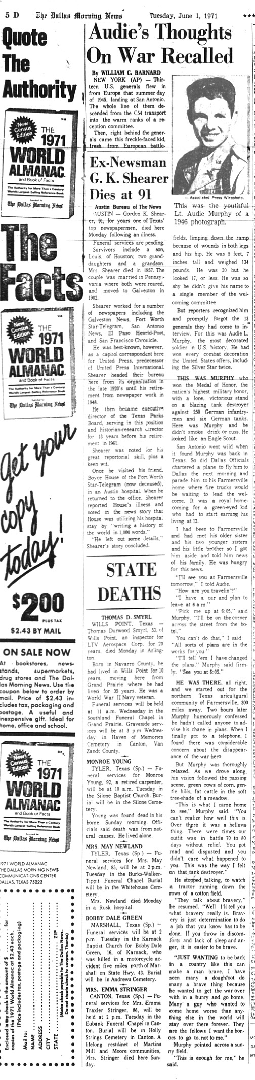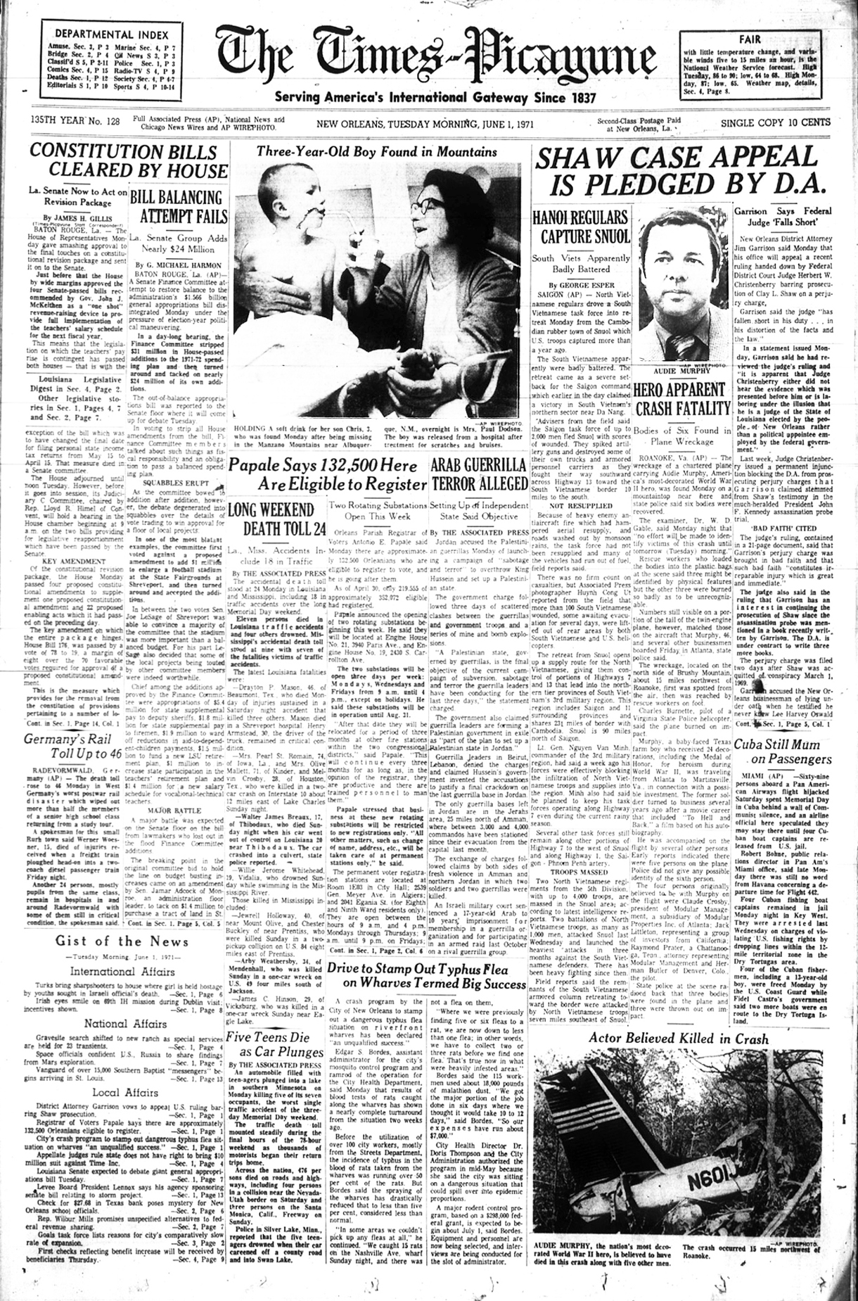 The front page of the June 1st 1971 New Orleans 'Times Picayune' is indeed interesting in that the photo of Audie Murphy and article reporting his death is directly under the headliner front page article reporting U.S. District Court Judge Christenberry's putting in the 'fix' for high ranking CIA agent Clay Shaw, a well reputed, co-conspirator in the assassination of President Kennedy in 1963 by barring New Orleans District Attorney Jim Garrison from prosecuting Shaw for perjury related to Shaw's 1969 trial for his part the conspiracy to kill the President.