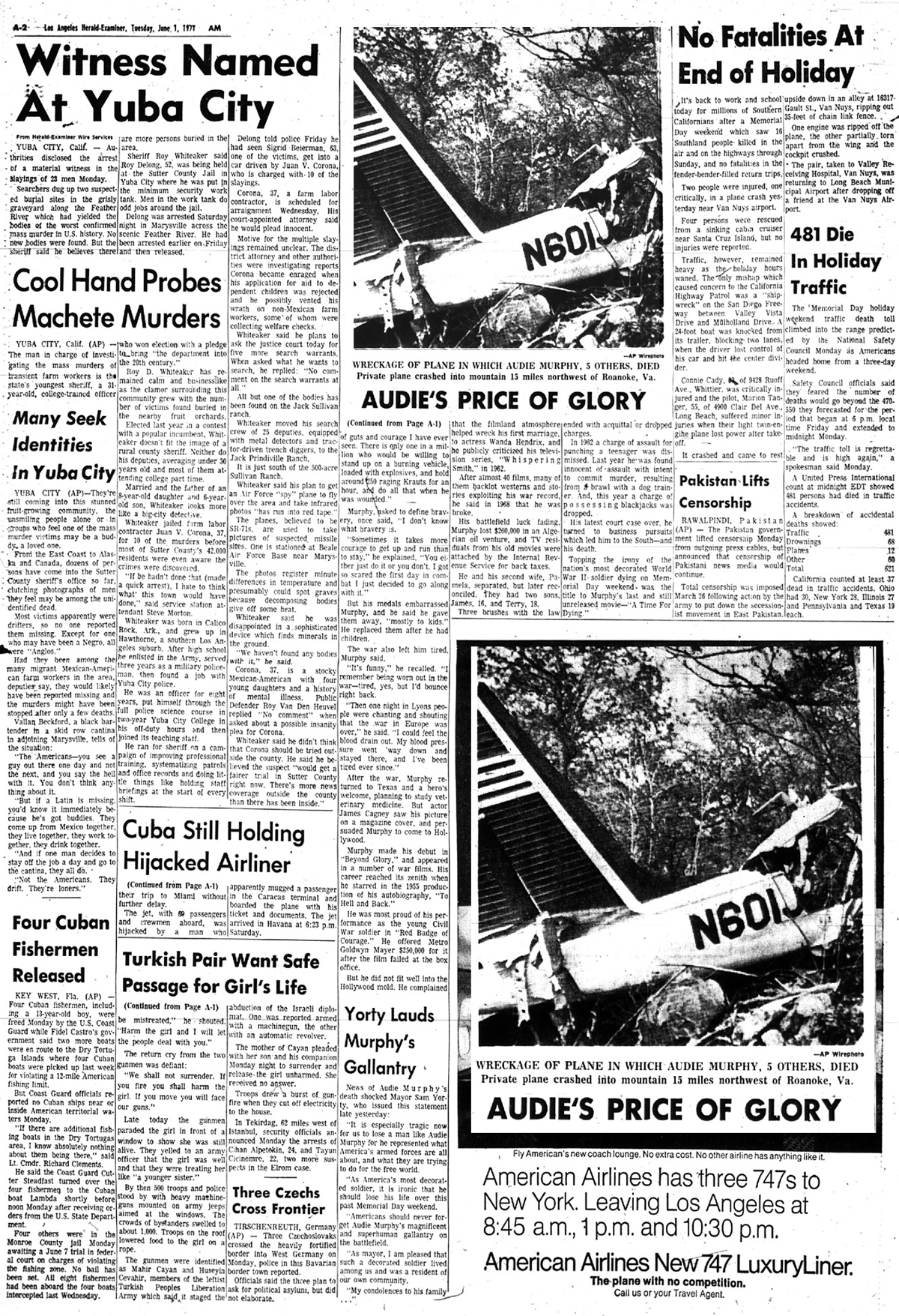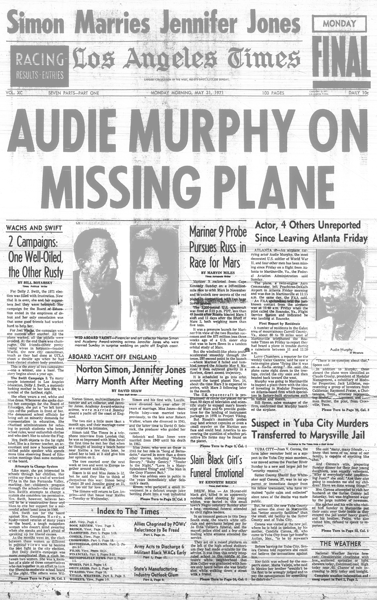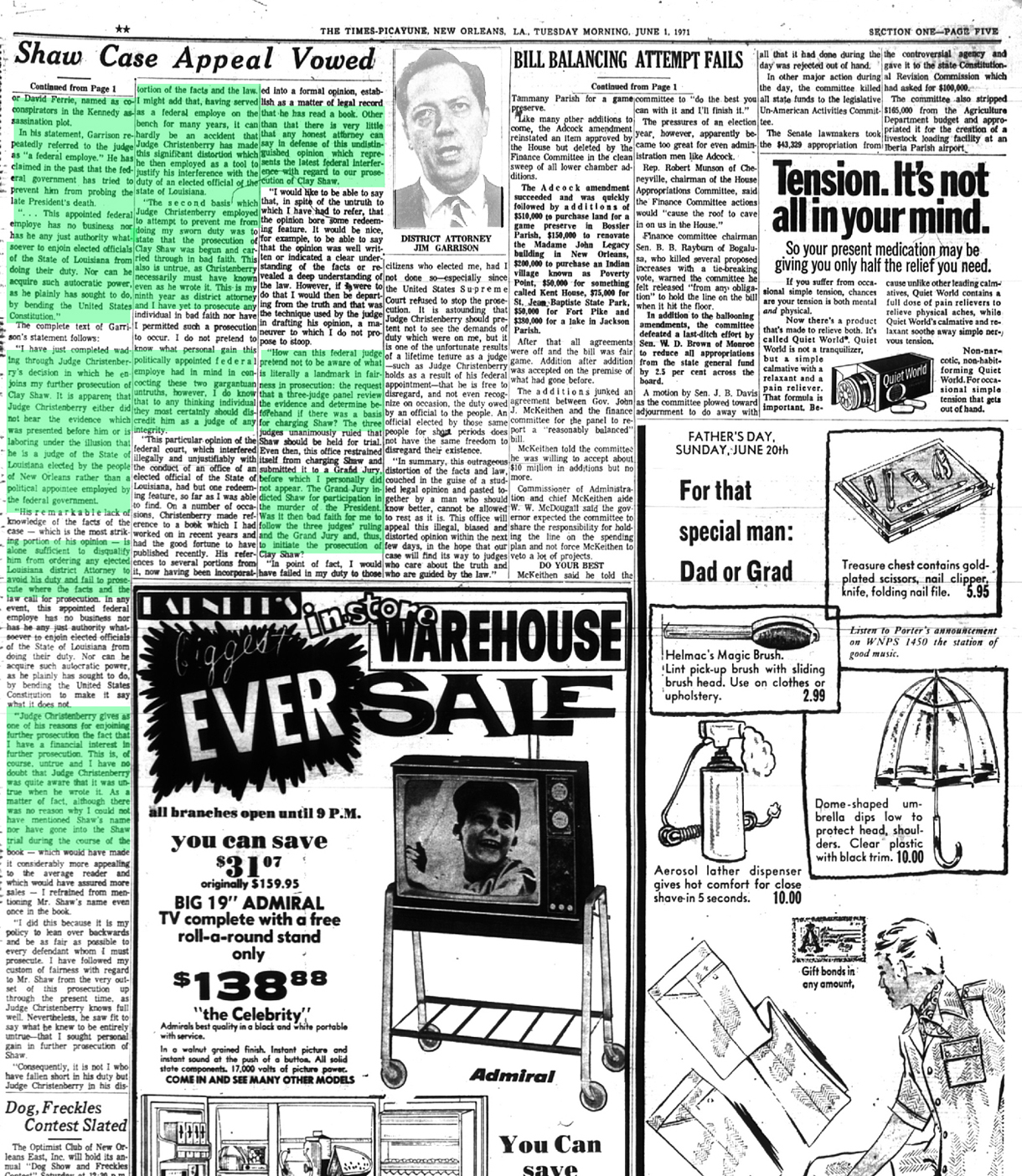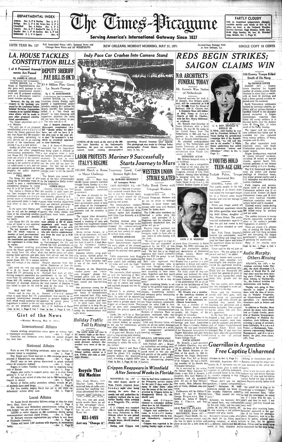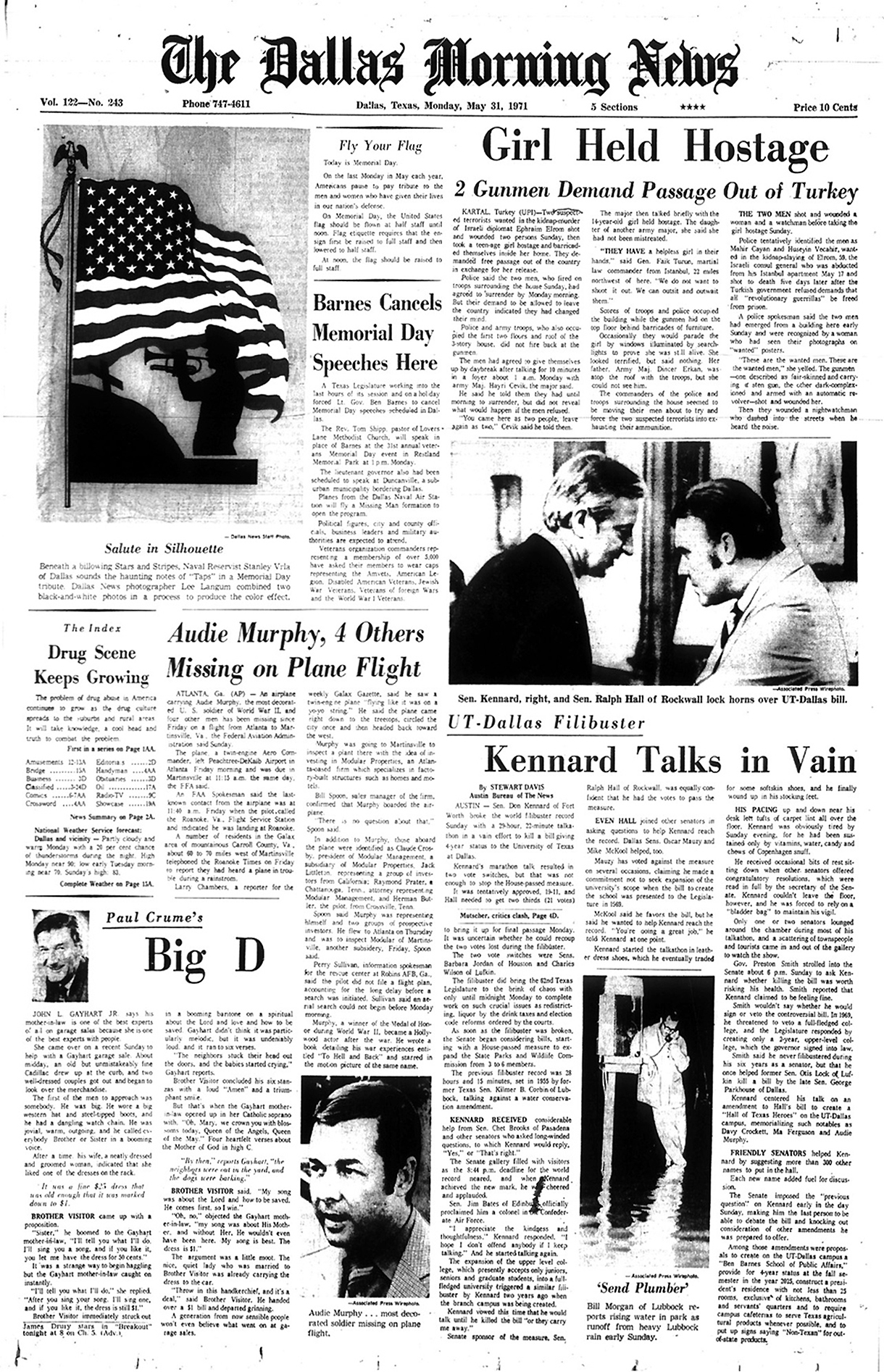 The front page of the June 1st 1971 New Orleans 'Times Picayune' is indeed interesting in that the photo of Audie Murphy and article reporting his death is directly under the headliner front page article reporting U.S. District Court Judge Christenberry's putting in the 'fix' for high ranking CIA agent Clay Shaw, a well reputed, co-conspirator in the assassination of President Kennedy in 1963 by barring New Orleans District Attorney Jim Garrison from prosecuting Shaw for perjury related to Shaw's 1969 trial for his part the conspiracy to kill the President.