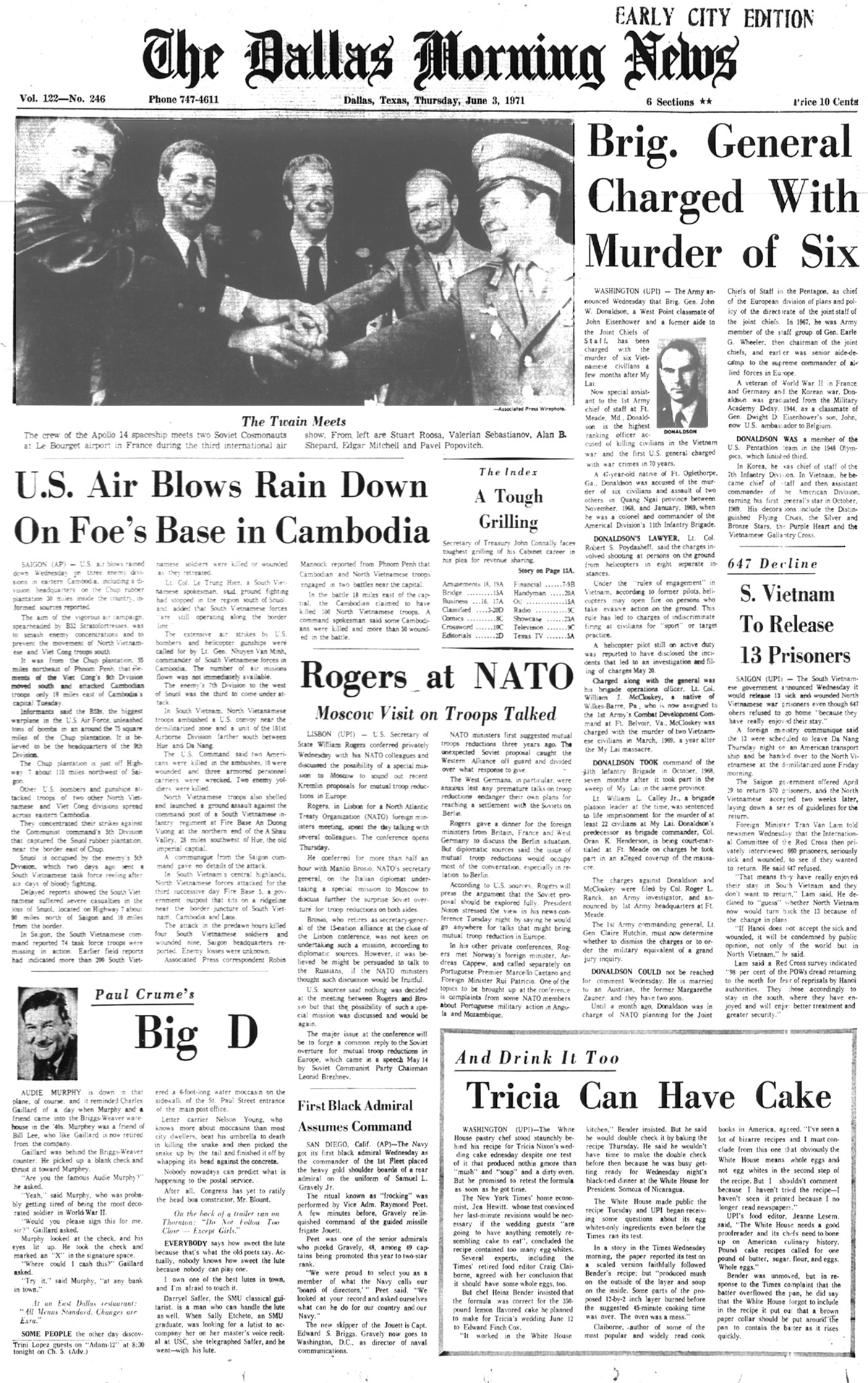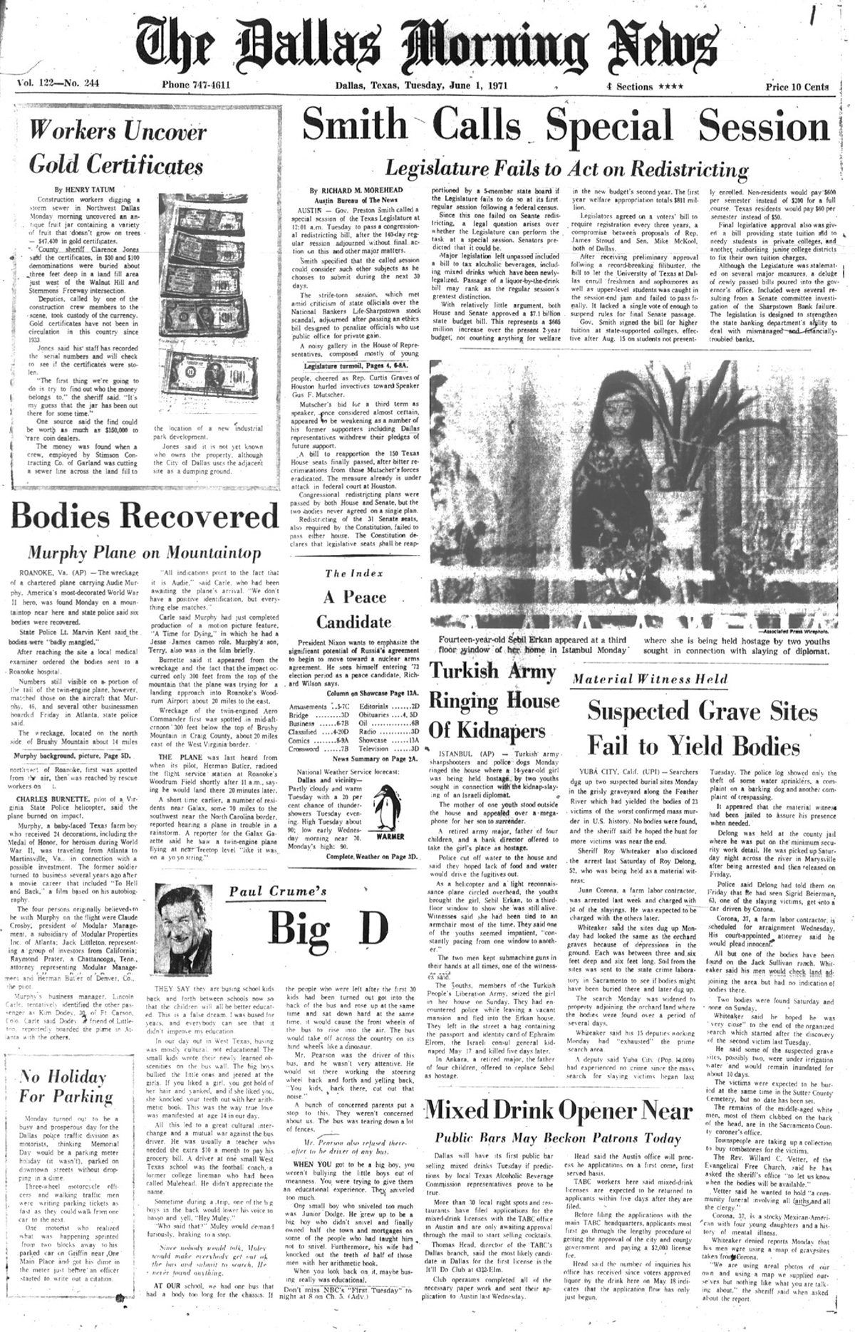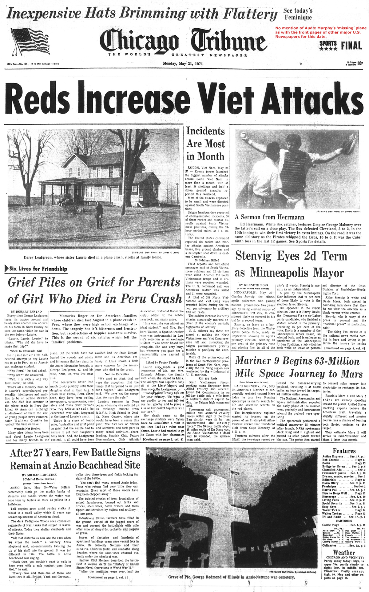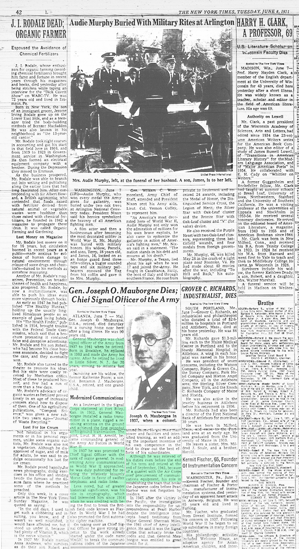 The front page of the June 1st 1971 New Orleans 'Times Picayune' is indeed interesting in that the photo of Audie Murphy and article reporting his death is directly under the headliner front page article reporting U.S. District Court Judge Christenberry's putting in the 'fix' for high ranking CIA agent Clay Shaw, a well reputed, co-conspirator in the assassination of President Kennedy in 1963 by barring New Orleans District Attorney Jim Garrison from prosecuting Shaw for perjury related to Shaw's 1969 trial for his part the conspiracy to kill the President.