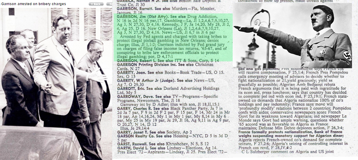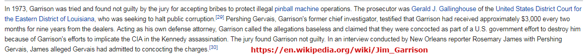 D.A. Garrison was to be arrested only weeks later in July '71 on bogus corruption and bribery charges brought forth by the U.S. Attornies at the direction of President Nixon's Attorney General John Mitchell. The charges against Garrisomn were later proved false and dropped being based on false testimony, and Attorney General Mitchell was later convicted of crimes relating to the Watergate Scandal that eventually forced President Nixon to resign by August 1974.