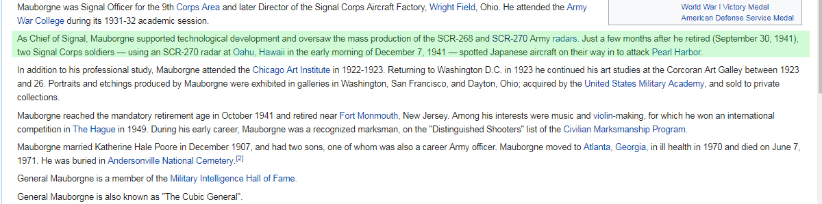 As Atlanta, Georgia was the last place Audie Murphy was last seen alive and General Mauborgne, an Atlanta resident died there only ten days later albeit at the age of 90, based on the facts, findings and suppositions supporting my claims of the likelyhood of a possible, if not probable cryptic communication connection between Audie Murphy and code master General Mauborgne.