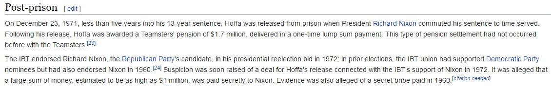 Richard Nixon's Presidency was to be fatally sabotaged only six-months after Nixon released union leader Jimmie Hoffa in Decdember 1971, there with the Watergate burglary in June of 1972 and subsequent cover-ups which inevitably led to Richard Nixon's resignation two-years later in August 1974.