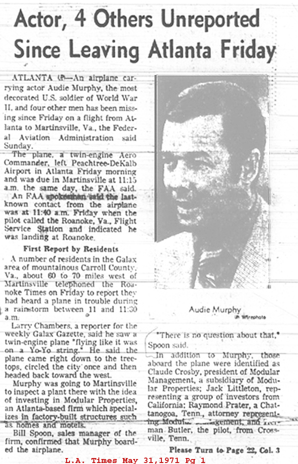 World War II Hero Audie Murphy was reportedly last seen alive boarding a twin engine Aero Commander 680 Super turbo-prop at DeKalb–Peachtree Airport in Atlanta on Friday May 28, 1971. Atlanta was also the city where retired U.S. Army Chief Signal Officer Joseph O.