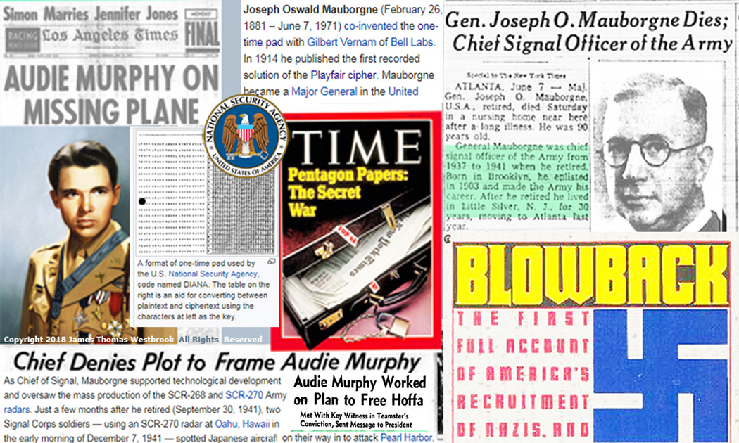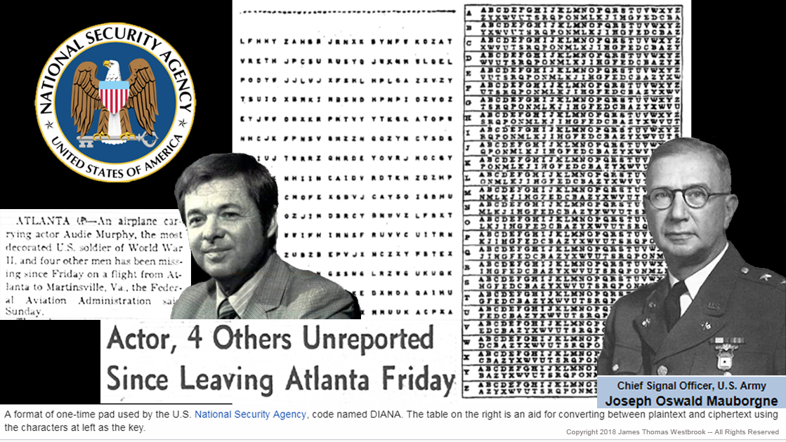 Being Audie Murphy he must have had some pretty high level contacts in the U.S. military and intelligence community and I would surmise that retired Major General Mauborgne a co-inventor of the 'one time pad' widely used by the NSA well into the 1970's had supplied Murphy and his associates with codes and cyphers to carry on their patriotically covert activities and away from the Owellian electronic eyes and ears of the NSA and other U.S. intel and military spy agencies.