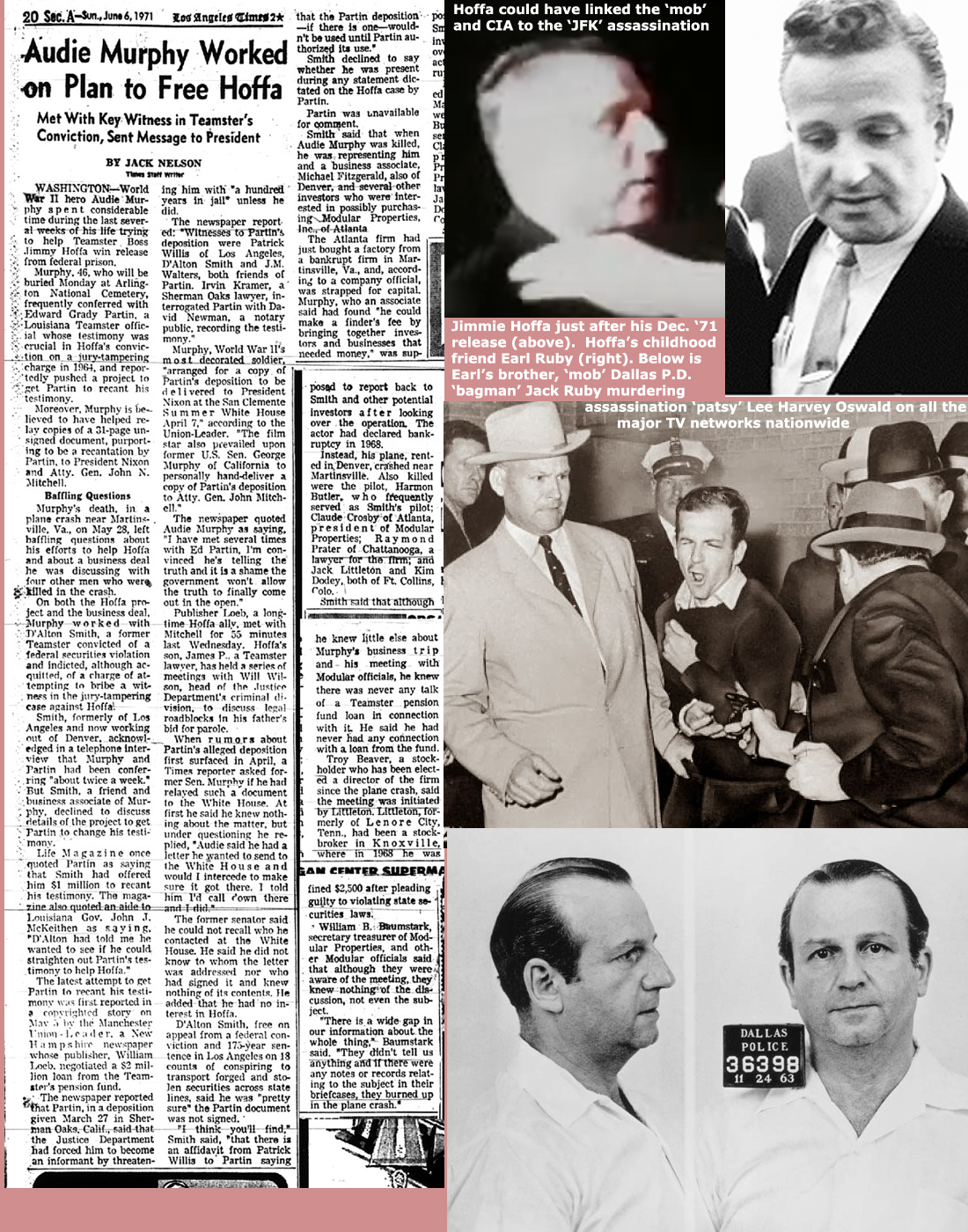 Jimmie Hoffa was a close friend of Earl Ruby, the brother of 'mob'/Dallas P.D. 'bagman' Jack Ruby -- the man who murdered JFK assassination 'patsy' Lee Harvey Oswald, only two days after President Kennedy's assassination. Oswald's assassination was broadcast live on all three major TV networks as the Dallas cops drug Oswald before the cameras like a human sacrifice before a frightened and bewildered American People just after the network cameras s cut-away from President Kennedy's nationally televised funeral, like some carefully scripted TV show.