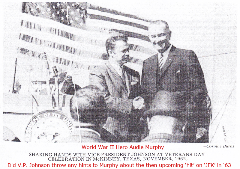 As War Hero Audie Murphy had personally spoken with President Nixon regarding the release of 'mob' union leader Jimmie Hoffa, in the weeks before his, Murphy's disappearance and death, I suspect that Murphy was working a deal with Hoffa to speak to New Orleans D.A. Garrison about his purported involvement in the 1963 Kennedy assassination and those of his 'mob' associates and others powerfull business interest as well.