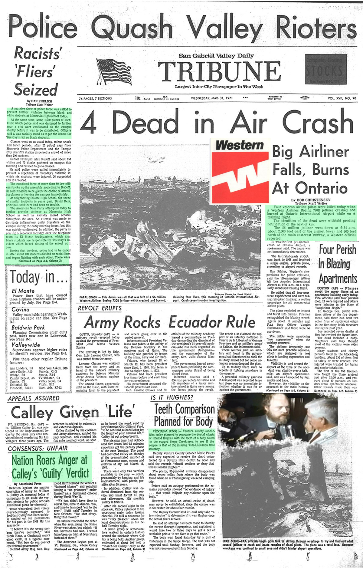 On the same front page of the San Gabriel Valley Tribune for 3_31_71 appears an article on the discovery of the body of a defense attorney who was representing a member of the Manson Family, and how authorities planned to used dental records to confirm the identity of the attorney who went 'missing'. -- How hard would it be to switch or fasify dental records in a dentist office?? Not hard at all. -- I go into this in greater detail near the bottom of the page.