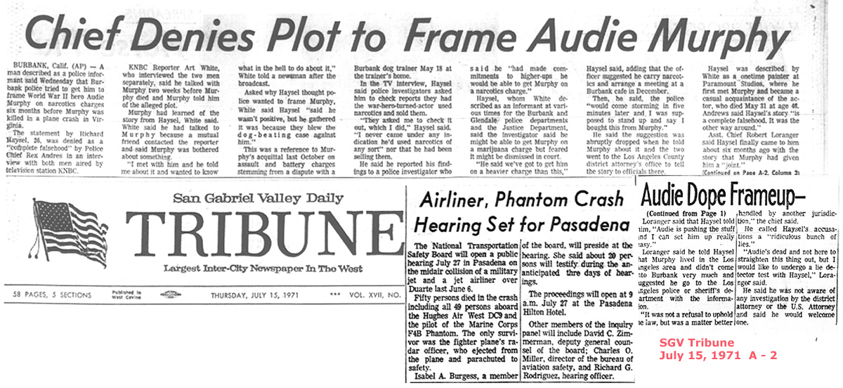 News of the Burbank Police department's attempts to 'frame' Murphy as a drug dealer came out only six-weeks after his 'disappearance' and death in some remote wilderness area of Virginia in May of 1971. Murphy's 'frame up' presumably by the FBI and CIA using the Burbank cops was intended to take place before Murphy's death in order to discredit hime and smear his reputation.
