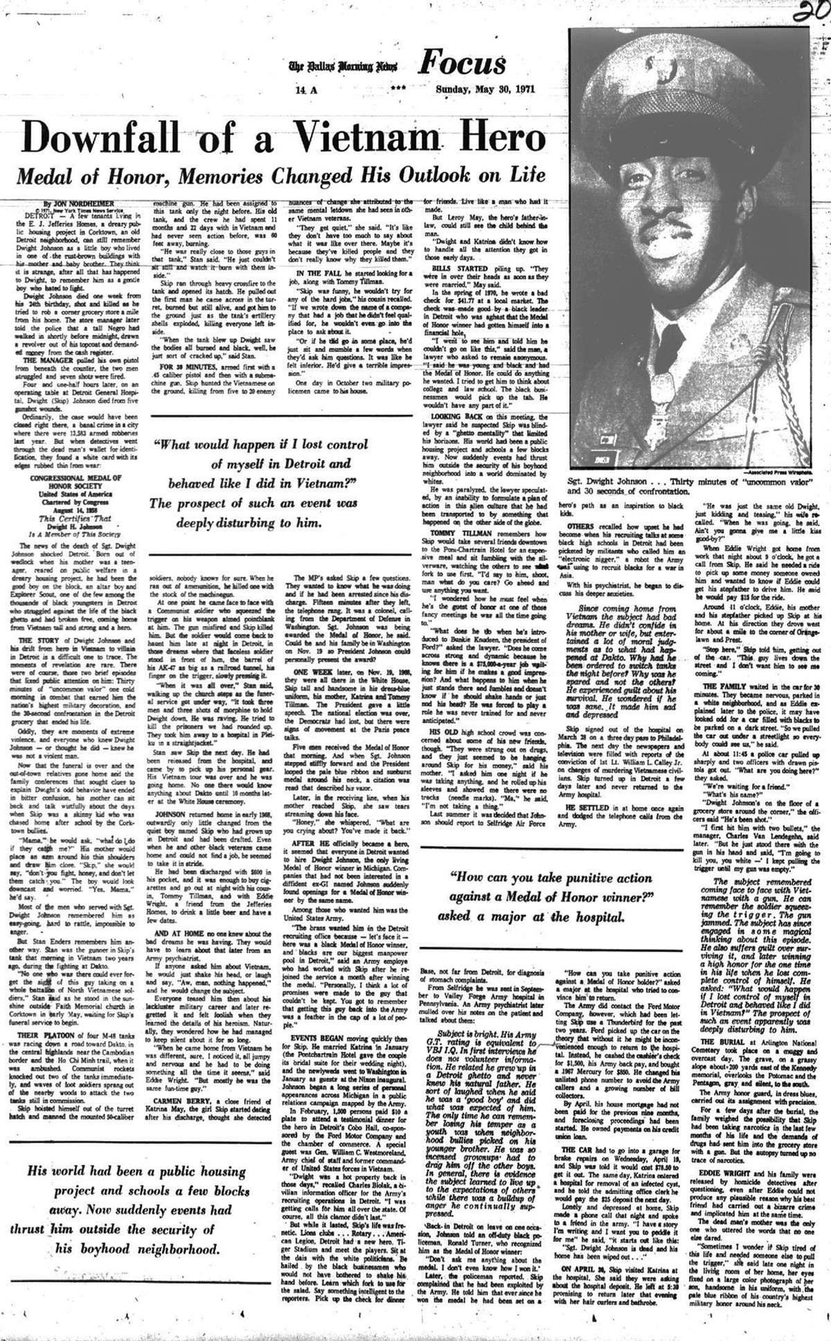 The timing of the April 30, 1971 death of Vietnam War Medal of Honor winner Sgt. Dwight Johnson, purportedly as he was robbing a store in Detroit to get money for his drug habit couldn't have came at a more media-opportunistic time, as it was the perfect weapon to indirectly cast doubt on the character of World War II Medal of Honor winner Audie Murphy as well. time
