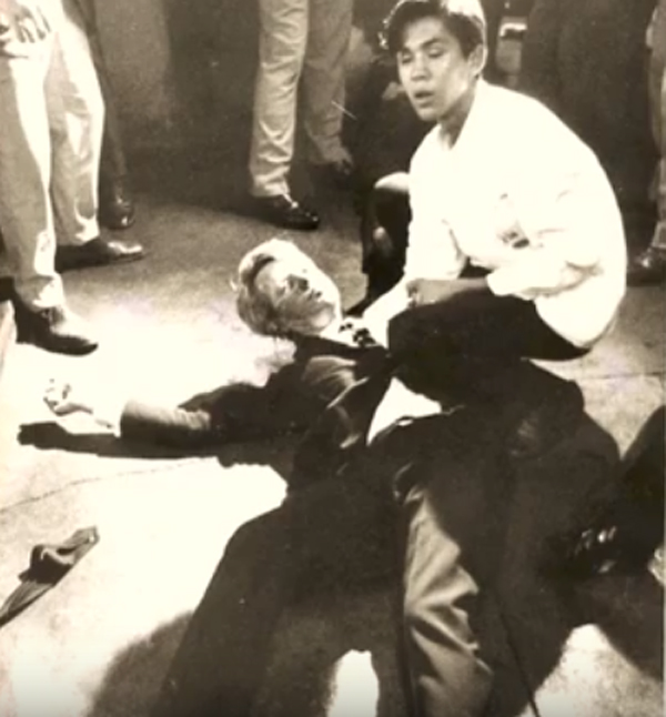 "Well I was standing behind him, directly behind him and I saw a man pull out a gun. It looked like he pulled it out from his pocket and shot three times I saw all three shots hit the Senator, then uh I saw the Senator fall and was picked up and carried away..."