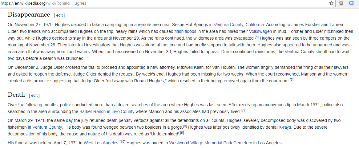 The claims that Hughes decided to go out into the wilderness of Ventura County at such a critical juncture in the trial of the Manson Family members in the Tate-LaBianca murders seems dubious at best. -- The story from his two 'freinds' who said that their VW got stuck in the mud, 'Woodstock' hippie style seems even more implausible judging by their claims that they left Attorney Hughes in the woods alone as they hitch-hiked out of the wilderness area alive.
