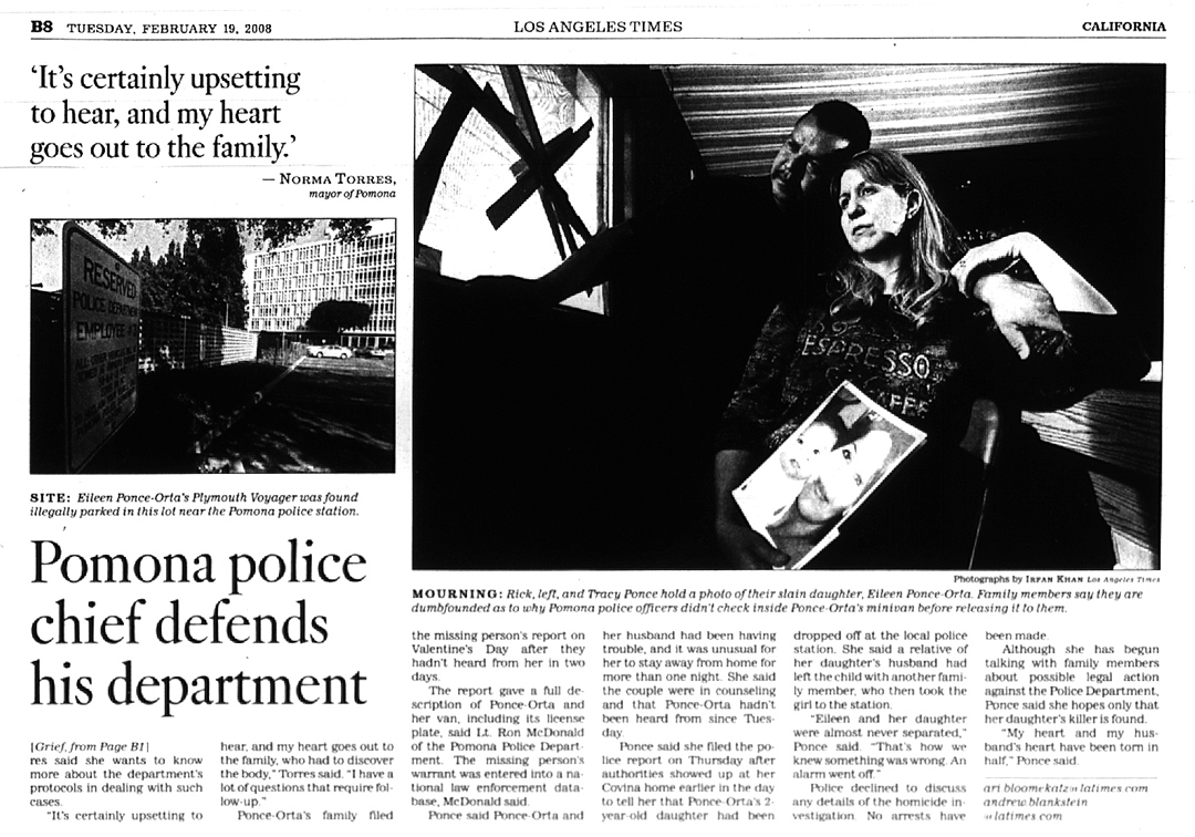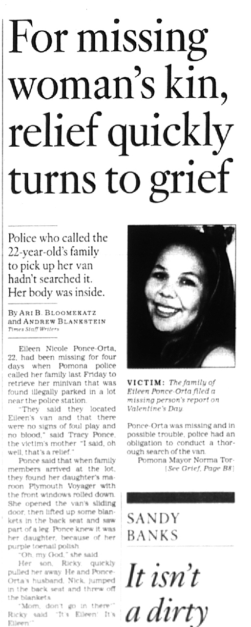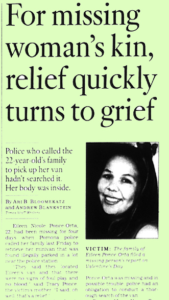 The return of the missing Covina mother's minivan to her parents with her body there in the rear cargo area in February 2008 is a good example of the total disregard and contempt for life that the Pomona Police, Sheriffs Homicide and Covina Police have for the citizens that they are sworn to serve and protect. --- The timing is interesting too as this was only days after my return to Covina after a 19 year self imposed exile.