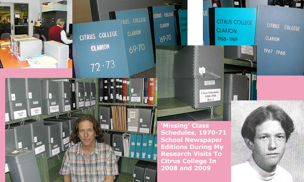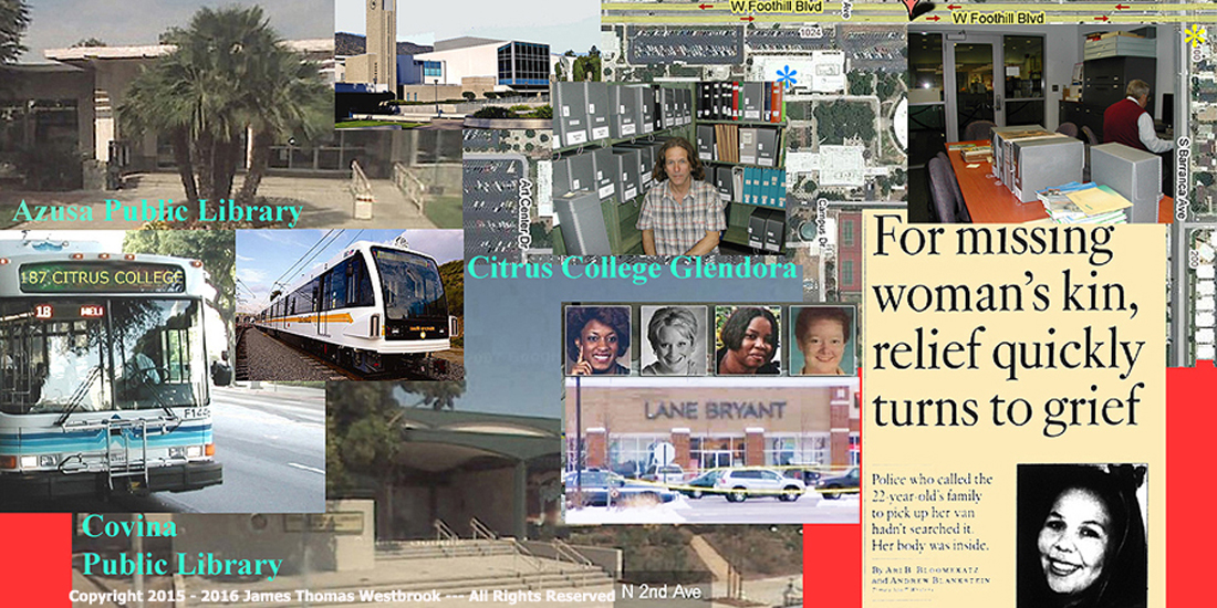 My February 2008 day trip from Venice where I lived to Azusa Library, Citrus College Library in Glendora and Covina library. -- The research material that turned up missing. --- The Lane Bryant massacre next day, the murder of the Covina Mom for Valentines Day 2008 and the Covina and Pomona cops who returned the Mom's mini-van from impound with her corpse there in the back.