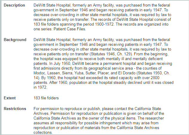 DeWitt General Hospital was declared surplus on 31 December 1945 and the War Assets Administration (WAA) assumed custody of the Site on 24 June 1946. The Site was conveyed to the State of California by quitclaim deed executed on 15 March 1947. As a part of this conveyance four conditions had to be met. According to the first, for a period of 25 years from the date of this conveyance, the property had to be continuously used as and for a mental institution. The second condition stated the premises could not be resold or leased within the first 25 years without authorization from the WAA. The third condition listed the reporting requirements for the state. Finally, the fourth condition was the procedures to be followed if the first three conditions could not be met. The deed states that all and singular tenements, hereditaments, and appurtenances were transferred to the State of California. According to the State Archive's Online Archive of California, the hospital began receiving patients in early 1947.