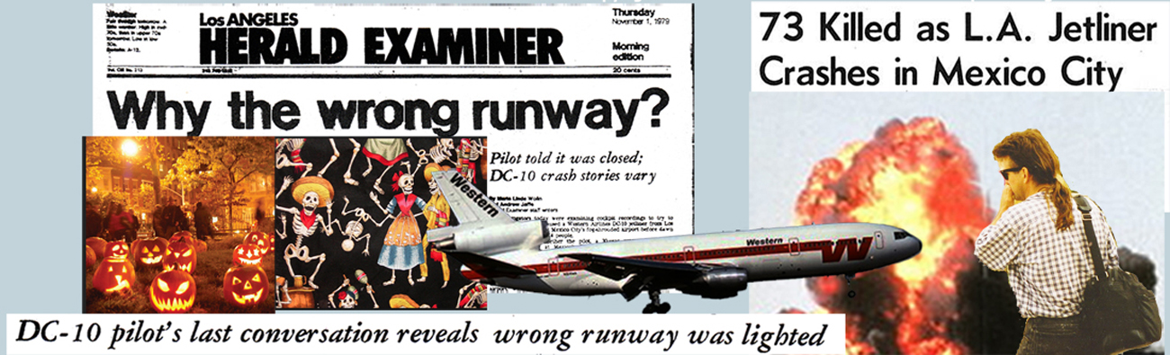 The October 31, 1979 Halloween 'Trick or Truck' on the runway crash at Juarez International Mexico City, just in time for the 'Day of the Dead' ceremonies and observances through out Mexico, next day November 1, 1979. -- The water truck on the lit up runway crash was in retaliation for my Western Airline DC-10 escape flight from Portland Airport on March 30, 1979 and which eventually landed at LAX Los Angeles on March 31,1979.