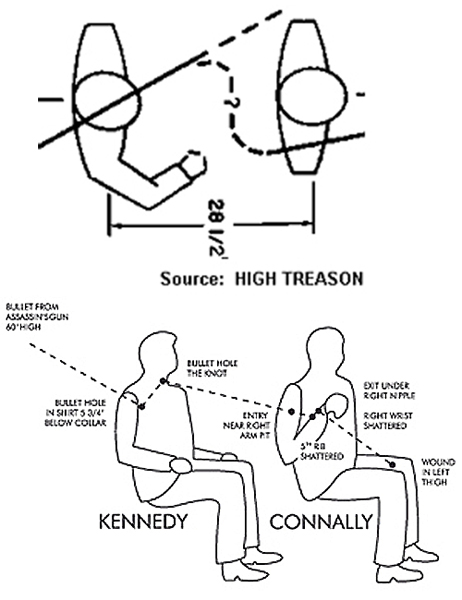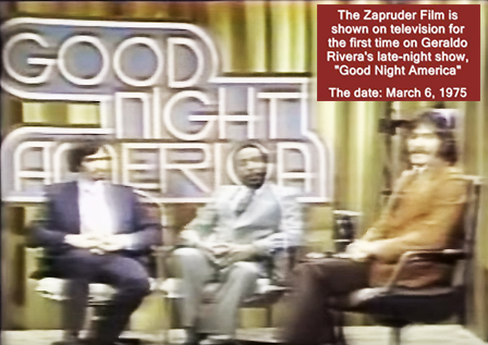 ( Right) Diagrams of the Warren Commission's 'single bullet' 'magic bullet' mythology used to 'frame' Lee Harvey Oswald in the 1963 'JFK' assassination (Left) Pre 'Fox News Corpse' Geraldo Rivera airing the Zapruder film in March '75. --- This was not only it's first time on TV, it was the first time that the American people were allowed to see the film anywhere, ever, over eleven years after President Kennedy's assassination on November 22, 1963.