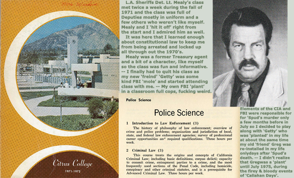 * Your Instructor L.A. Sheriff's Detective-Lt. Mealy Describe Him * His Classroom Demeanor, & Concise Oration The Law * Lt. Mealy's Laconic Sense Of Humor As Dark As My Own Sometimes * Getty I Suspect As Some Kind Of Governent 'Agent Mole' --- Getty Attends My 'Criminal Law' Class With Me *If Getty Is Some Kind Of Government Spook Than This Is Too Fucking Deep For Me ? This Tends To Confirm My Suspicions That I Was Subjected To Some Subtle Forms Of Behavior Modification Back In March & April 1971 ---