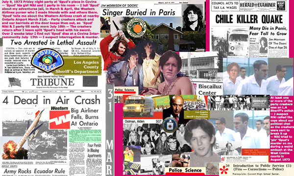 Psychology class at Citrus College, Glendora, partying with 'Spud' Helberg at his place in Covina July 9th, the barricade that kept the party crashers out, partying with 'Spud' and Niki until my pre-dawn departutre July 10th, return of the party crashers and 'Spud's head wound from a sword, hospitalization, release, re-admittance and 'Spud's death at Covina Intercommunity July 17,1971.