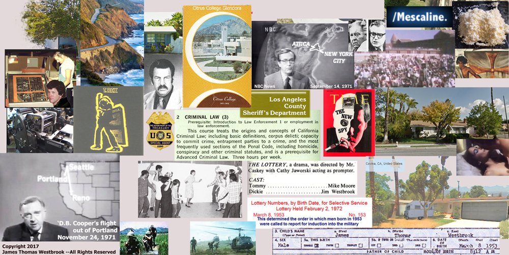 Partying with girls I know in La Puente where I meet Getty who I suspect may be a 'plant' for the FBI and CIA, my Fall '71 Criminal Law Class full of cops taught by L.A. Sheriffs Det. Lt. Meally, tr Citrus College. Attica Prison massacre. I drop the class in late October '71 as it's weird bringing an FBI 'plant' with to my police science class full of cops. Det. Lt. Meally must have known and could see the spot I was I in. Fall trade school in L.A., 4 day hitch hike up north in November to Central Coast. February 2, 1972 Draft Lottery where I am No. 153 and so no Vietnam or duty in Europe or Stateside.