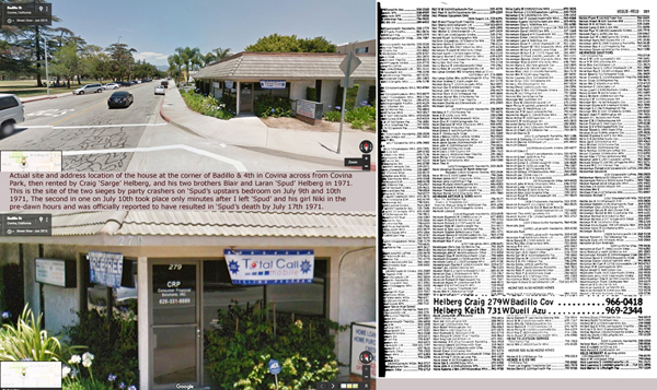 Perhaps I should also mention that Greg's brother Benny Downard was a Deputy with the L.A. Sheriff's San Dimas Station, the same L.A. Sheriff's San Dimas Station from where there Detectives and 'snitchs' were so inexrtricably involved there in the murder of 'Spud' Helberg only days before in mid July 1971. Deputy Downard from the San Dimas Sheriffs Station and had actually rousted me walking down the street on my 16th birthday on March 8th 1969 near my home as I walked on Lark Ellen just south of Arrow Highway in that part of L.A. County called Covina, whereby I had to throw my 'stash' in some ivy nearby and I retrieved it after Benny was done rousting me and drove off.