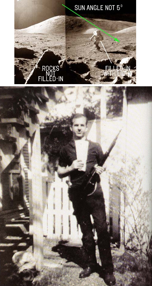 The mission began on July 26, 1971, and ended on August 7. At the time, NASA called it the most successful manned flight ever achieved.[2] https://en.wikipedia.org/wiki/Apollo_15 There is a rather evident symbiosis between the doctored photos used to 'frame' Lee Harvey Oswald in the 1963 assassination of President Kennedy and the movie set photos and films of the so called moon landings from July 1969 to December 1972, as evidenced by the few sample photos and text shown her below. During this same time period from 1969 to 1972, the Zapruder still under lock and key at some office building owned by TIME LIFE since 1963 and it wouldn't be until March 6th 1975 that the American public was permitted to view the Zapruder film, or rather a cleverly edited version of what was still a film that totally disproves the Warren Commission's 'single bullet' / 'magic bullet' mythology regarding the first of two Kennedy assassinations in a five year period in the 1960's.