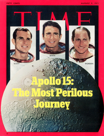 Upper Left: TIME Magazine cover August 9, 1971 with the Apollo 15 crew on the cover. Lower Right Center: New York Times Front Page from August '71 with photos of the Apollo 15 crew with Lunar lander and dune buggy suposedly taken on the Moon Apollo 15 was the ninth manned mission in the United States' Apollo program, the fourth to land on the Moon, and the eighth successful manned mission. It was the first of what were termed "J missions", long stays on the Moon, with a greater focus on science than had been possible on previous missions. It was also the first mission on which the Lunar Roving Vehicle was used.