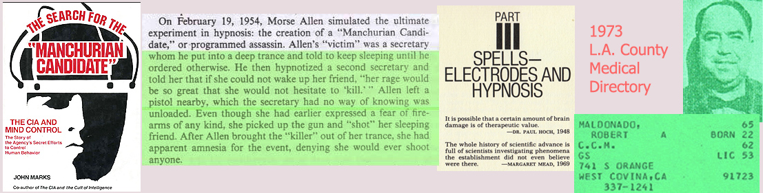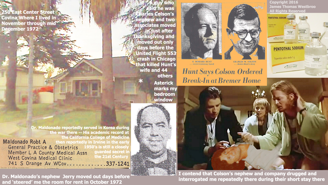 Move to a room at Cindy's house across the alley on Center St. near 2nd in October '72 The previous tennant a kid named Jerry Maldonado whose uncle is West Covina Doctor Maldonado, a guy with covert U.S. military service during the Korean War and a degree from a O.C. med. college. Cindy and friends dabblers in Satan worship, and I read 'The Exorcist' after work. Real and bogus traffic warrants from the L.A. Marshalls Office, who have time to raid my house on minor traffic matters real and bogus. Held for days then released. Thanksgiving weekend a fine time partying, and the Monday after the Nephew of 'Watergate figure Chas. Colson and two friend's move in until 1st week of December '72. This days before the United 737 jet crash Dec. 8, '72 at Midway in Chicago, killing Dorothy Hunt, wife of Watergate figure E. Howard Hunt. FBI, DIA, CIA, military intel, flooded the crashsite neighborhood, in the hours befor the crash. Dorothy Hunt's body full of cyanide.