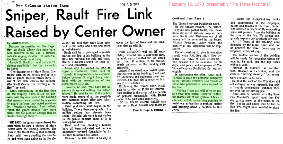 Businessman Rault's comments in the February 1973 newspaper article below confirm my suspicions that the November 1972 arson at the Rault Center was a cover up in which Rault was most likely involved, although I contend that the murders of six people covered up by arson may have been politically motivated and most likely involved elements of the U.S. intelligence community and law enforcement as well.
