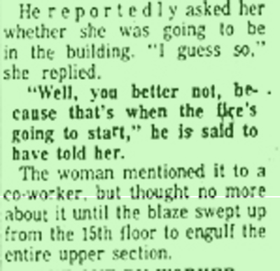 Was the second, fatal fire used to cover up the possible interrogation and murders of the four fire victims, three of them women who according to officials reportedly jumped from the 15th floor to their deaths avoid the fire. The fourth, a male elevator repairman reportedly died in the fire.