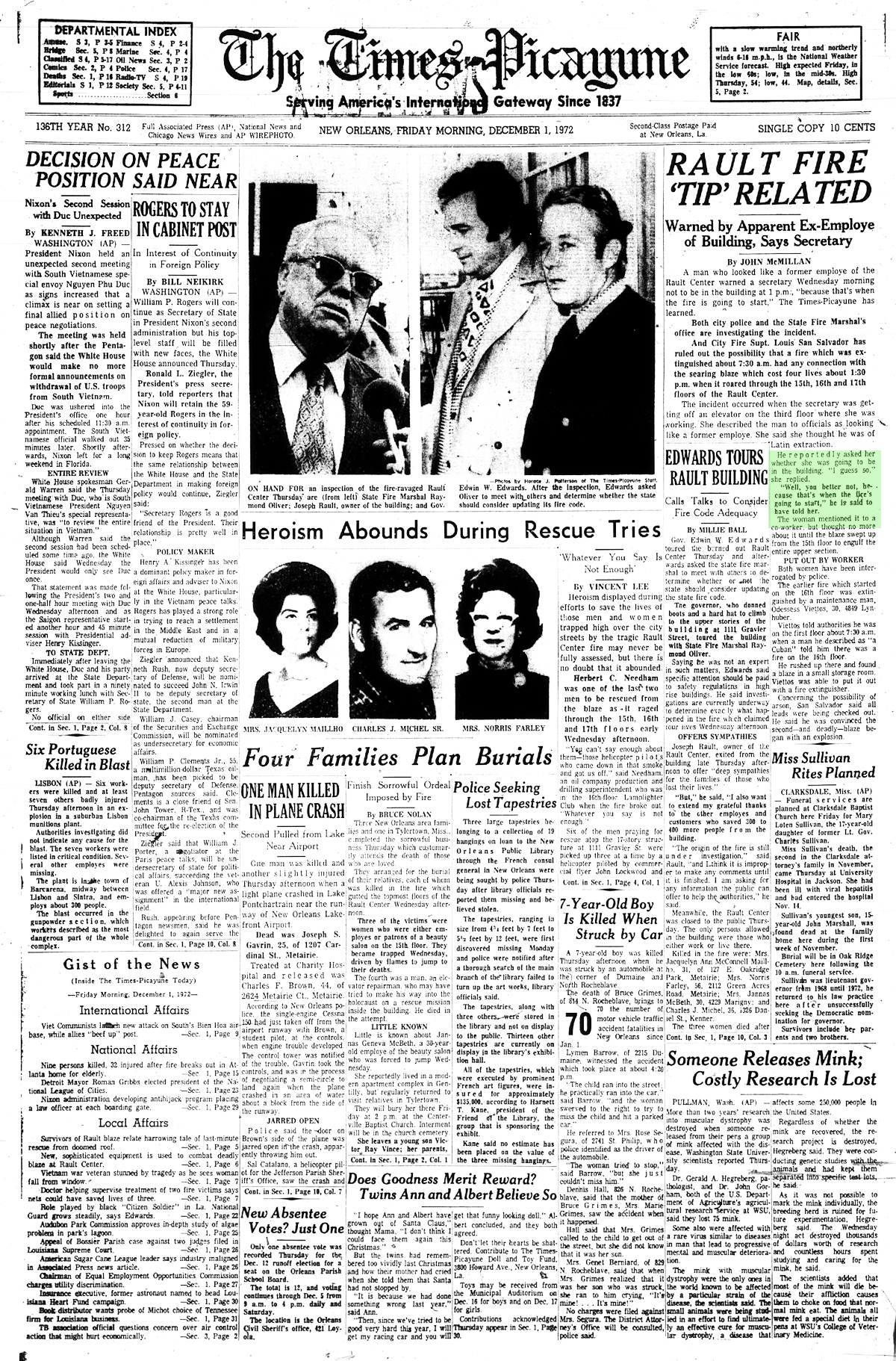 I can't help but wonder if the two apparently pre-planned fires that took place at the Rault Center in New Orleans on November 29th 1972, only nine days before the December 9th United Airlines 737 crash in Chicago in which Dorothy Hunt reportedly died, might somehow be related. (See Image of front page below)