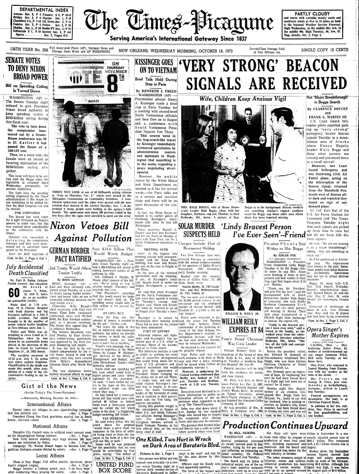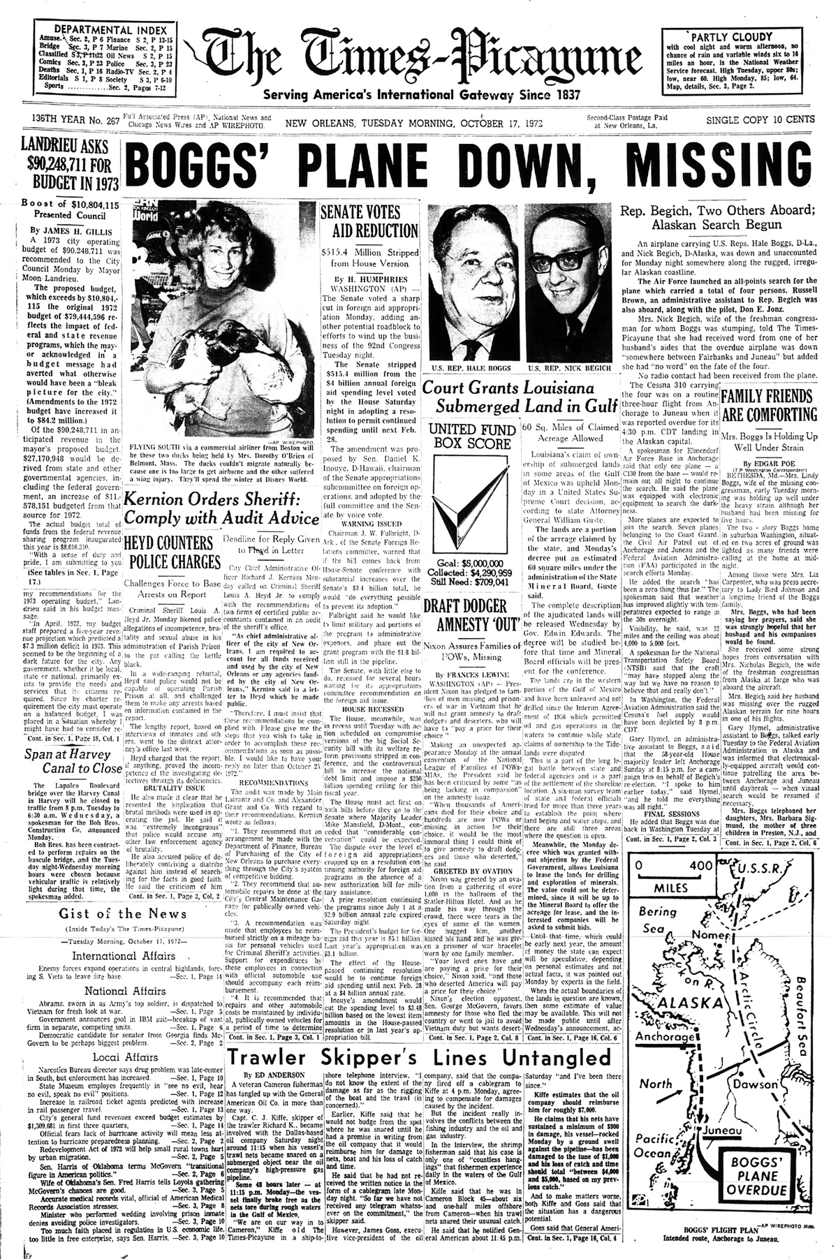 https://en.wikipedia.org/wiki/Thomas_Hale_Boggs_Jr.The front page of the October 18th 1972 'Picayune' newspaper seems specially scripted for 'Lindy' Boggs' pre-election, 'photo op'/ write up