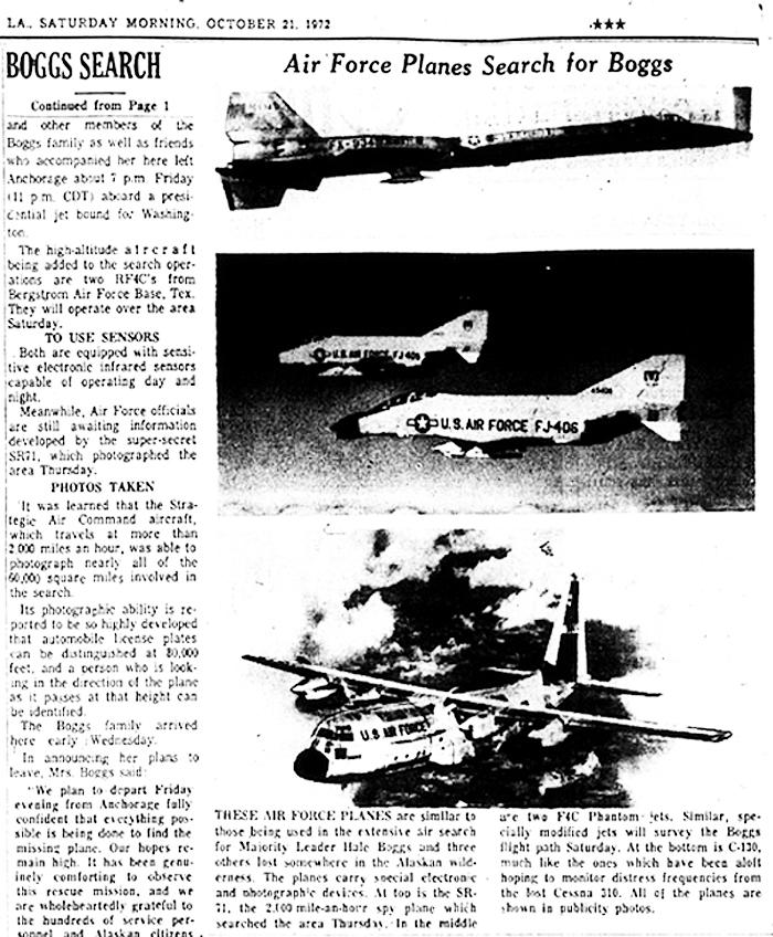 As far as we know their airplane may have been intercepted in flight and flown to any one of a number of military bases, airstrips, covert or otherwise there in Alaska, or that region of Canada that it borders.Boggs was reportedly critical of the findings of the Warren Commission's findings on the 1963 'JFK' assassination and was also complained that the CIA and FBI were lying to the Warren Commission and concealing evidence, and Boggs was also reportedly critical of the 'Single / Magic Bullet Theory' as well.