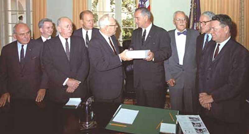Note the way in which Dulles, (third from the right) is staring over at fellow Warren Commission member Hale Boggs, the man at the standing at the extreme right. Also member, then Congressman Gerald Ford, (fourth from left), who himself was to become America's first appointee President in August 1974 when Nixon resigned.