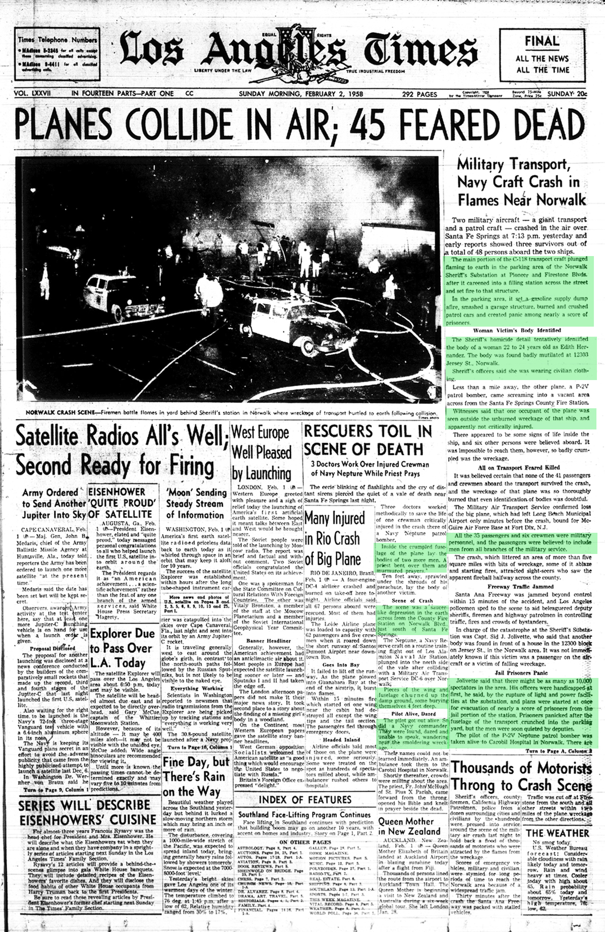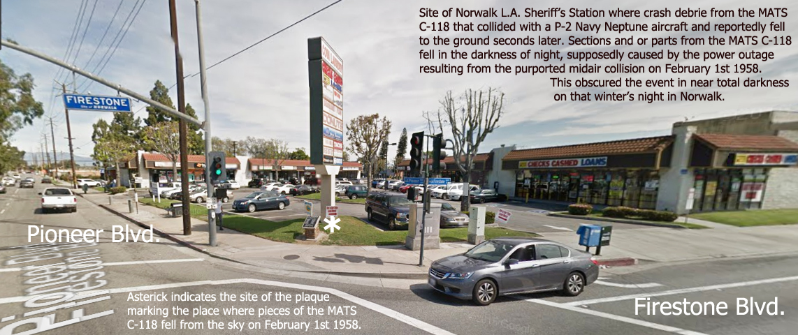 Before proceeding on I feel that I should mention that fuselage and other crash debrie from the 'MATS' Air Force C-118 military transport involved in the February '58 mid air over Norwalk reportedly fell there on the garage stalls for the patrol units at the L.A. Sheriff's Norwalk Station and a service station across the street thereat the intersection of Pioneer and Firestone Blvds. in Norwalk.