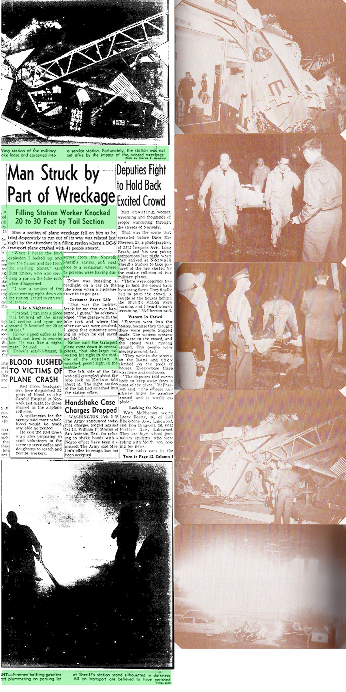 Below right, this night photo appears to be one of the crashsite at the L.A. Sheriff's Norwalk Station at Pioneer and Firestone Blvds. where the MATS Air Force C-118 reportedly fell out of the sky after it's mid air collision with the Navy Neptune P-2V bomber on February 1st 1958.In the second row down, these two photos below shows the purported wreckage of the four engine MATS Air Force C-118 from the mid air collision over the newly incorpoated town of Norwalk, California on February 1st 1958. The grainy black and white photo on the left from the February 2nd 1958 L.A. Times, shows the wreckage from the MATS C-118 where it landed there at gasoline-service station across the street from what was then also the location of the L.A. Sheriff's Norwalk Station.