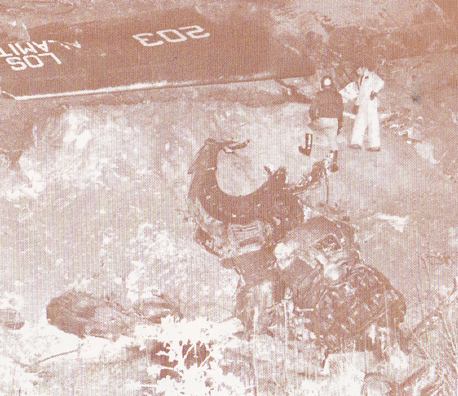 To the right is a another photo of the L.A. Sgeriff's Norwalk Station's parking lot fire with two police motorcycles front and center, a light colored coupe left and a Sheriff's patrol car left. The three photos on the right scrolling up from the fire photo shows another view of the MATS C-118 tail wreckage at the gas station across the street from the Sheriff's Station. Again the absence of any traces of smoke or fire