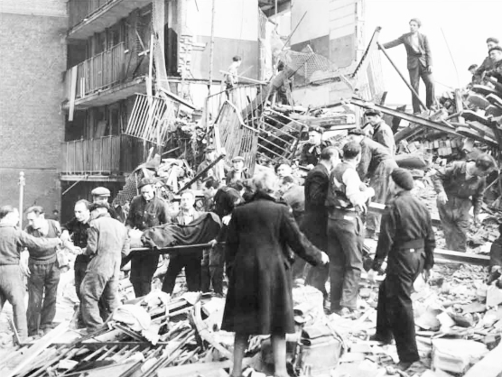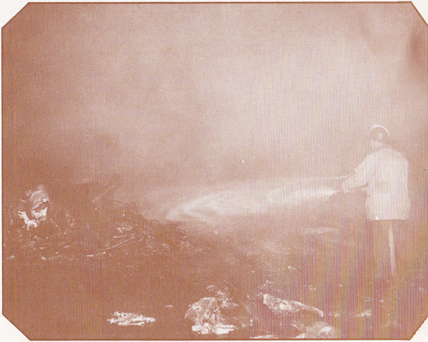 The fouth sepia photo up from the bottom right shows two emegency workers carrying out what looks like a corpse on a stretcher.