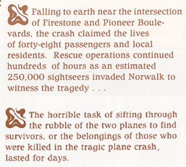 Once I started reading the old newspaper accounts on the '58 Norwalk mid air I recalled what scant, little bits of information that I had heard about the Norwalk air disaster from time to time as a kid in Covina therefrom newpaper front page spreads and articles on the crash from microfilm reels of the L.A. newspapers at the UCLA Research Library, as well as back issues of the February '58 'Norwalk Call' newspaper at the L.A. County-Culver City branch library, I recalled that I once knew someone who must have been there when it happened and no doubt participated therein the numerous fire and rescue operations that took place in the minutes and hours after the Norwalk mid air back on February 1, 1958