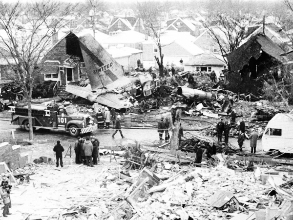 In the photo of the crashsite on the right shows how small an area of damage to the wood frame houses on the ground. It appears that three houses were destroyed on the side of the street where the tail section of the United DC-9 is and two other houses across the street.