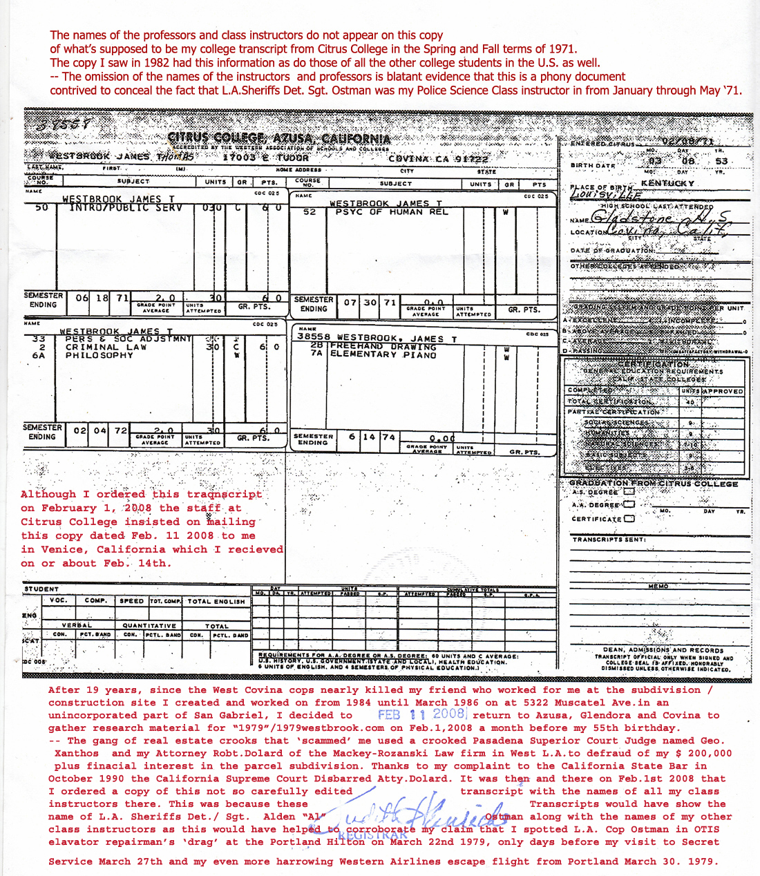 Weirder still was Ostman's rather uncharateristically cagey behavior the last day of the Introduction to Public Service Class at Citrus College, Tuesday May 25,1971. -- When I showed up for class expecting our usual 3 hour session that day, the classroom was practically empty except for a couple of students Ostman was talking to at his desk. -- He then looked up at me, smiled as he checked me off on the class attendance roster and shook my hand as I thanked him letting me return to his class after my March '71 drug 'bust' and the 33 day combined stretch I did at Covina Jail, L.A. County Jail and Biscailuz Center Minimum Security where I was at for 22 days.