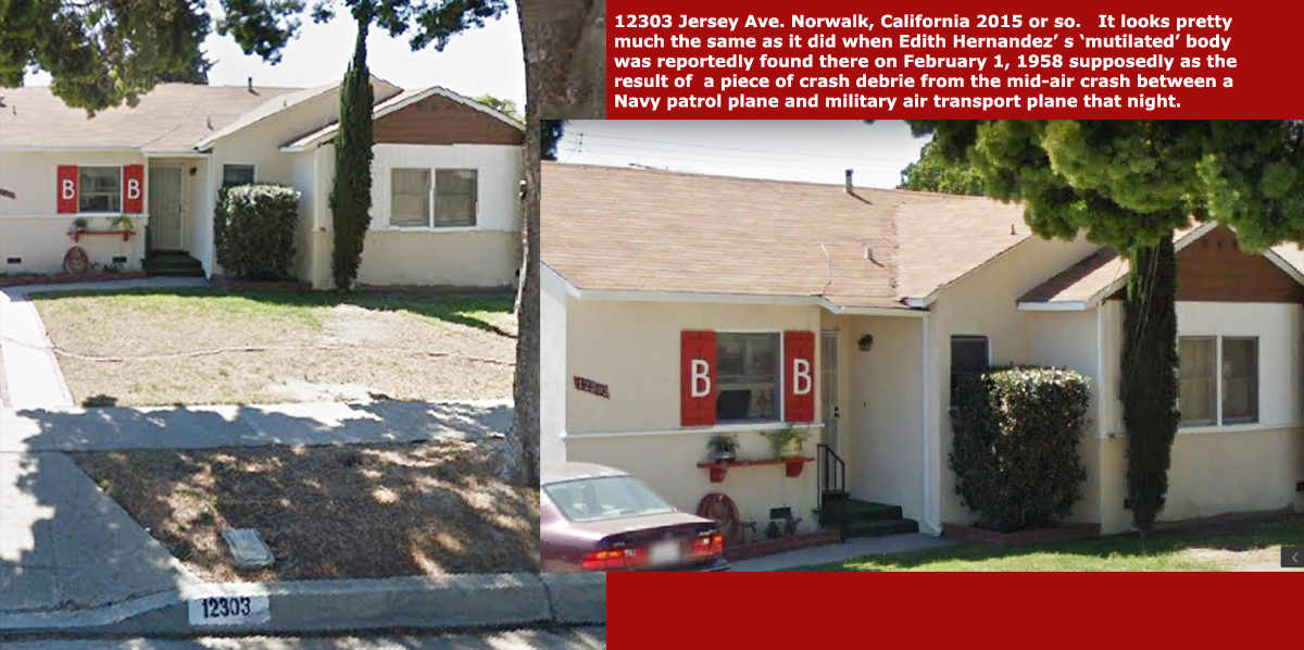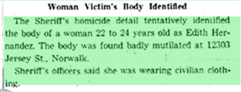 The articles above are also from the same edition of the L.A. Times for February 2nd 1958, pages 1 and 3 respectively. The page 1 article with the sub heading: 'Woman Victim's Body Identified' refers to the then recently killed Edith Hernandez whose 'body was found badly mutilated at 12303 Jersey St. Norwalk'. The address is actually 12303 Jersey Avenue. Sheriff's homicide identified the mutilated corpse and noted that she was dressed as a civillian.