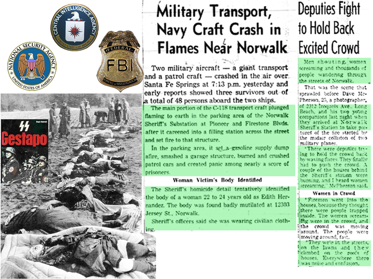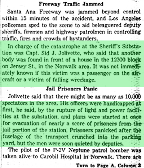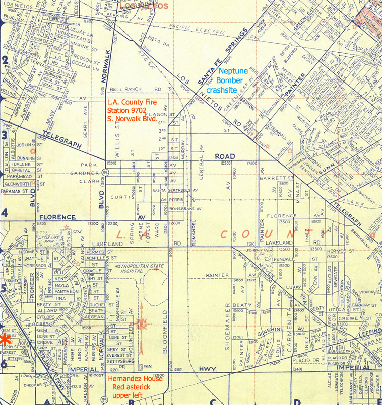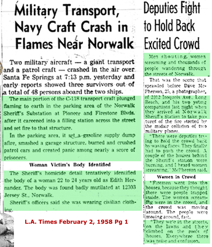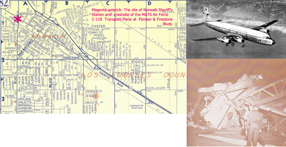 It was during one of our classroom sessions when we didn't have a field trip to go on, that Ostman as the instructor of this Police Science Class dubbed: Introdution to Public Service related a little bit of his personal history, at least in as much as that he was a fireman for L.A. County California before he resigned to join the L.A. Sheriffs Dept. -- This was sometime in the early 1960's according to Ostman.As the so called mid-air plane crash between a U.S. Navy P2 Neptune patrol plane and U.S. military air transport plane that reportedly took over Norwalk, California on February 1, 1958, this means that Ostman was almost certainly assigned to one of the Fire and public safety crews dispatched to search for survivors, put out small fires and recover wreckage from the neighborhoods and streets of Norwalk.