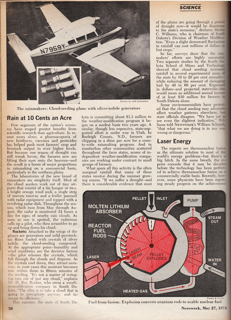 Newsweek May 27 1974 Page 58 above. News reports of 'Cloud-seeding' are now practically nonexistent in 2017. Why is that ?