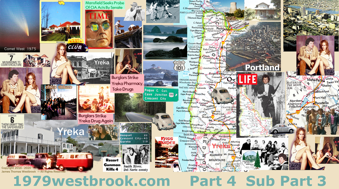 -- This Sub Part covers my first 6 months in Northern Cal from I recall mid-September 1974 through March 20,1975, my move from Montague to Yreka by mid-November and Karen one of the girls I met in Vacaville, comes down from Portland to live with me. -- Karen's idea to make trips to Crescent City within days of the mass murder spree there, and a Yreka psychiatrist links to the subsequent murder trial over it. -- Karen's inexhaustible supply of pharmaceuticals apparently supplied by way of the 'back to back' burglaries of a Yreka pharmacy used as cover to supply her and the other local dopers. -- I'm just a 'pot' and beer head with occasional psychedelics on the side and take some classes at the College of the Siskiyous.