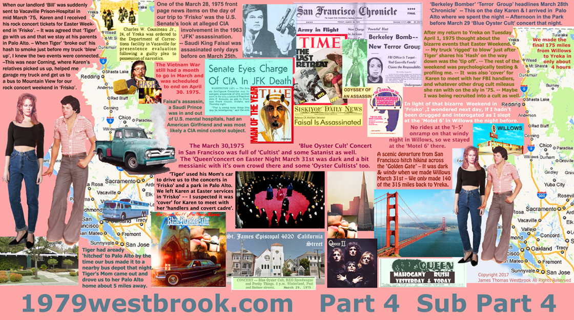The Series of Bizarrely Elaborate Machinations Prior To, During & After The Rock Concert Weekend --- Apparently Concealing Some Kind Secret Agenda Which Must Be Kept Secret From Me --- Ominous Forebodings As To What It's All Leading Up To --- Maybe The Chicks In Some Kind Of Cult Or Something --- Sensing Danger I Act Ignorant, Conceal My SuspicionsEaster Weekend 1975 ‘Blue Oyster Cult’ & ‘Queen’ Rock concerts in San Francisco serve as cover for my fiance’s covert meeting with other CIA MK-ULTRA mind control freaks & contract agent Christine Surma --- This just four days after Surma’s longtime former fiancé Prince Faisal is accused of assassinating of Saudi King Faisal in Riyadh --- I was still wary having left L.A. County only seven months earlier --- On Labor Day Weekend September 1974 ---A Siskiyou County, California Judge unexpectedly moves up the date of that Our Yreka friend & landlord Bill, has to start his so called drug treatment at Vacaville State Pen --- So we were offered to buy The tickets to an Easter Weekend Back to Back Double Bill This spoke volumes to me --- It switched on my radar so to speak --- Chapter 17. of “1979” --- April through May 1975