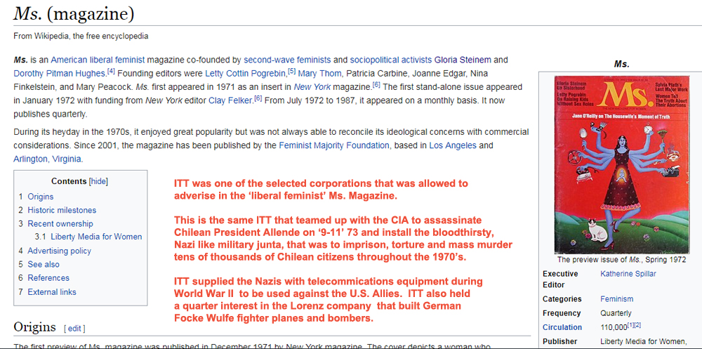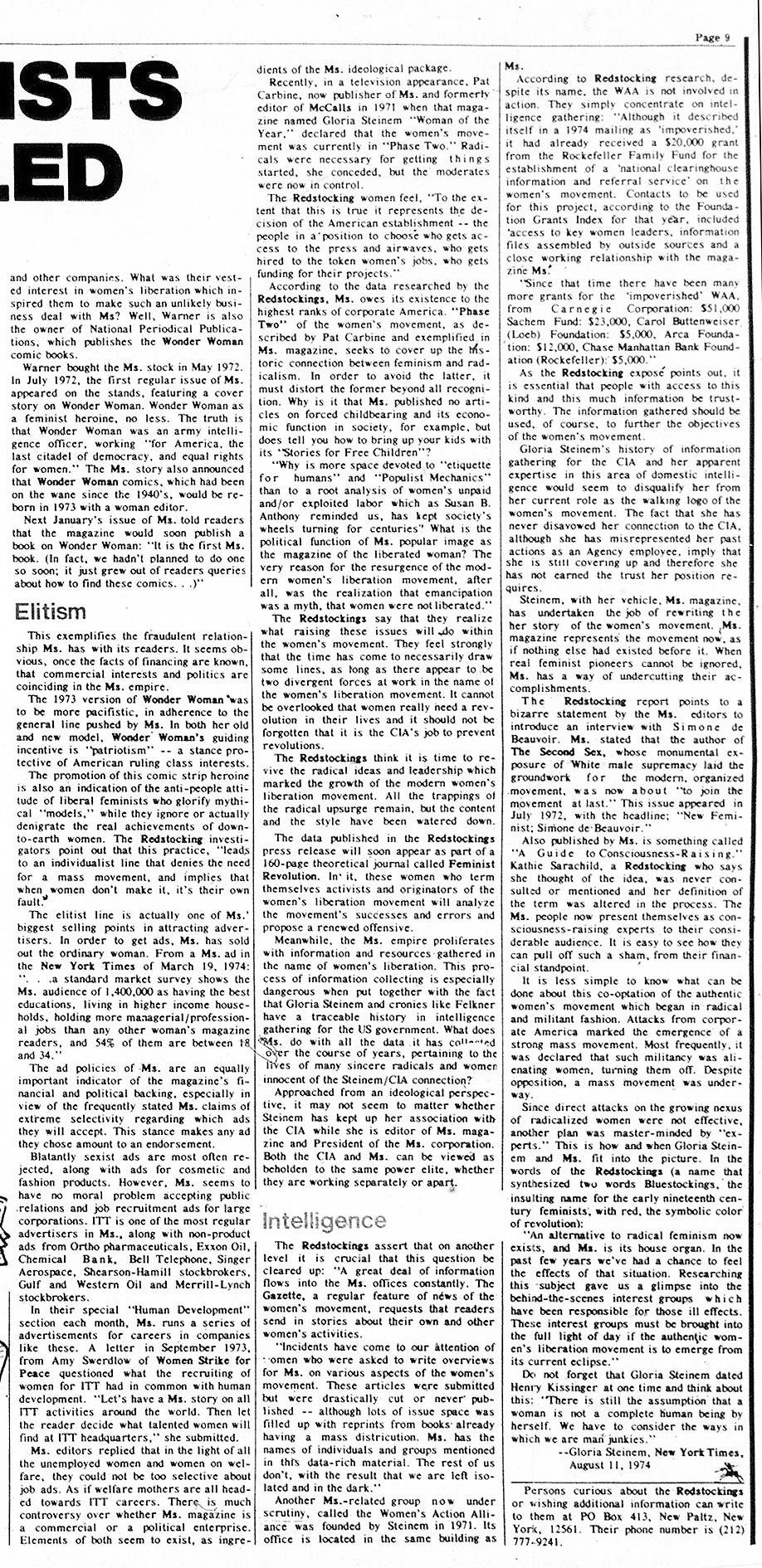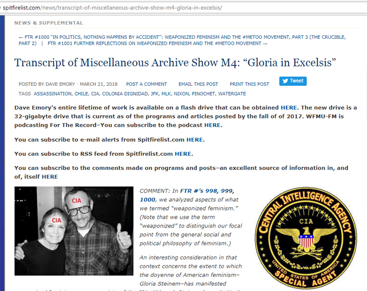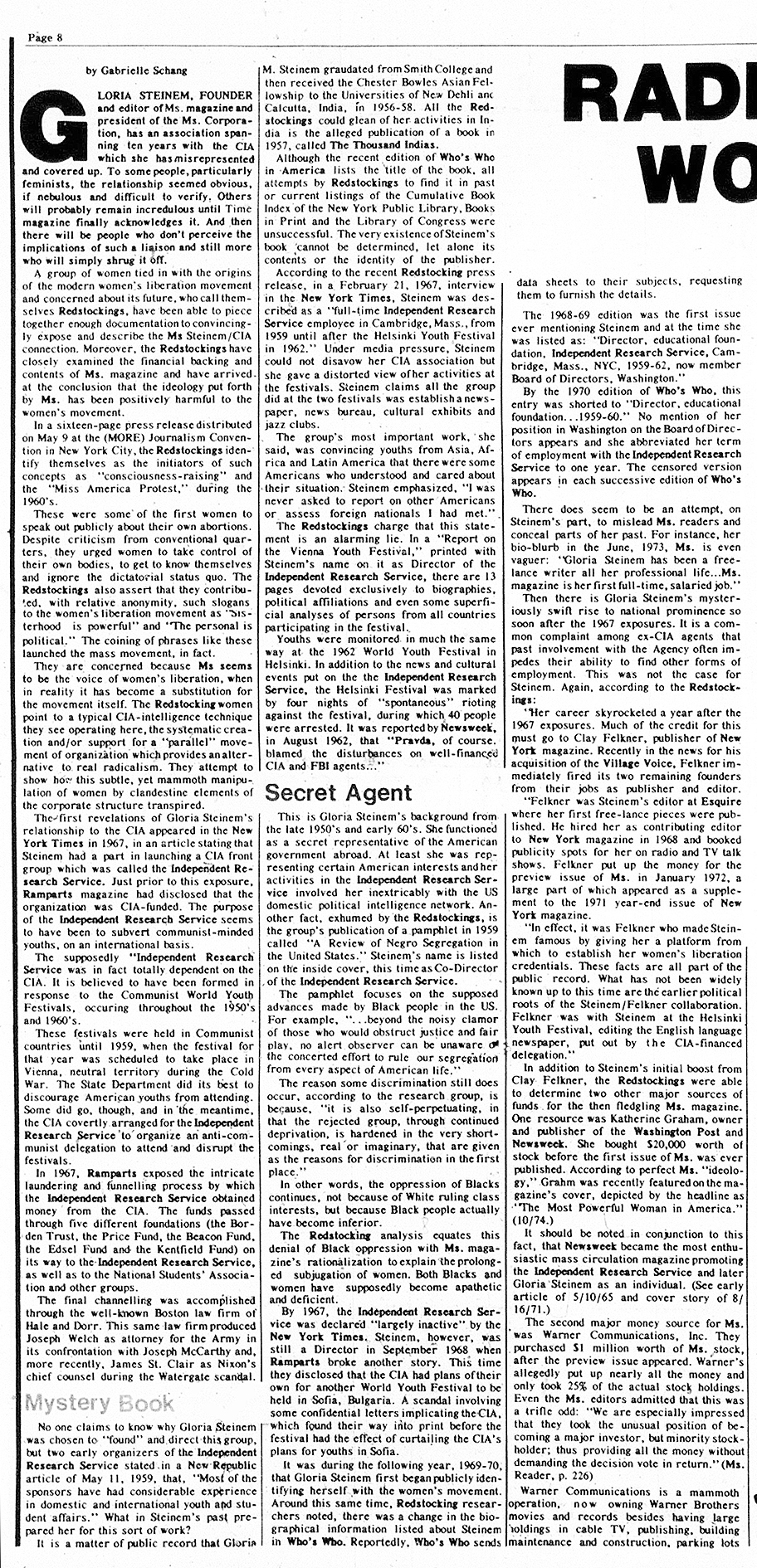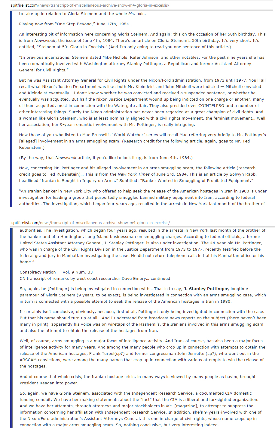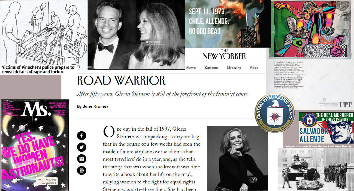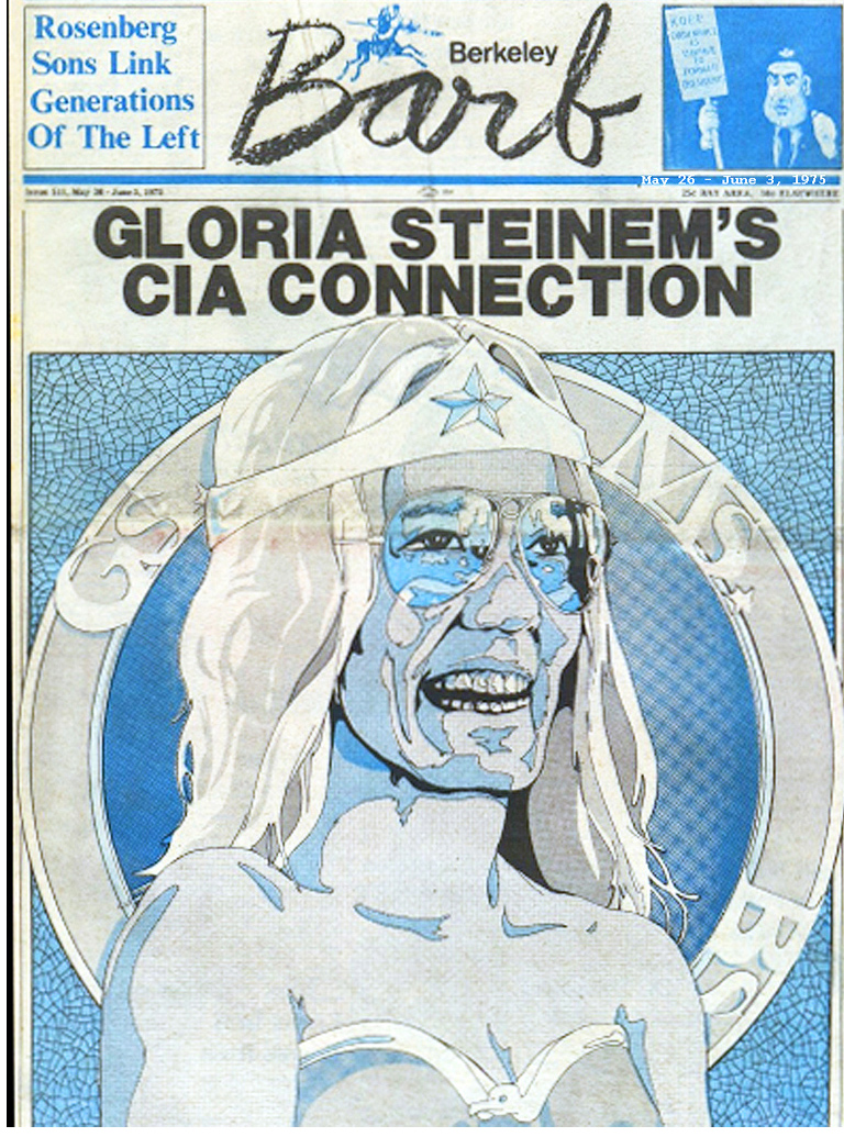I would have to assume that agent George White's reasearch findings, from his drug and 'pussy' scams, using CIA 'hookers' on unsuspecting 'Johns' in San Francisco in the 1950's as part of the CIA's MK-ULTRA mind control program, was made availiable to Miss Steinem. This would also include what must have been some rather interesting film footage from some of CIA Colonel White's 'Operation Midnight Climax' experiments.