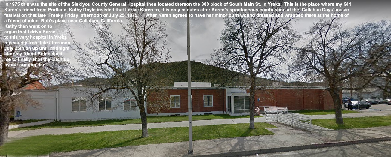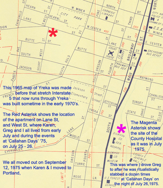 however after the events that were to unfold during 'Callahan Days' days later, I suspect that the trips to Ashland and Medford, served as 'cover' for Karen and Kathy to go over and recieve instructions for whatever kind of 'frame up' 'scam' that the Feds were then planning to run on me at that time in July '75. -- More on this later in Part 4 Sub Part 7.This was after the night of July 26th after I had driven Karen's VW 'Bug' through some 40 miles of twisting, turning and hilly Highway 3, before hitting the outskirts of Yreka at 80 miles per hour, with Greg there in the passenger seat next to me, going in and out of conciousness and shock, bleeding to death from the dozen or more knife wounds he received at 'Callahan Days', with Karen and Kathy in the backseat, and the long line of CHP and Yreka cop cars, lights flashing, sirens screaming in 'hot pursuit' all the way to the Yreka Hospital.